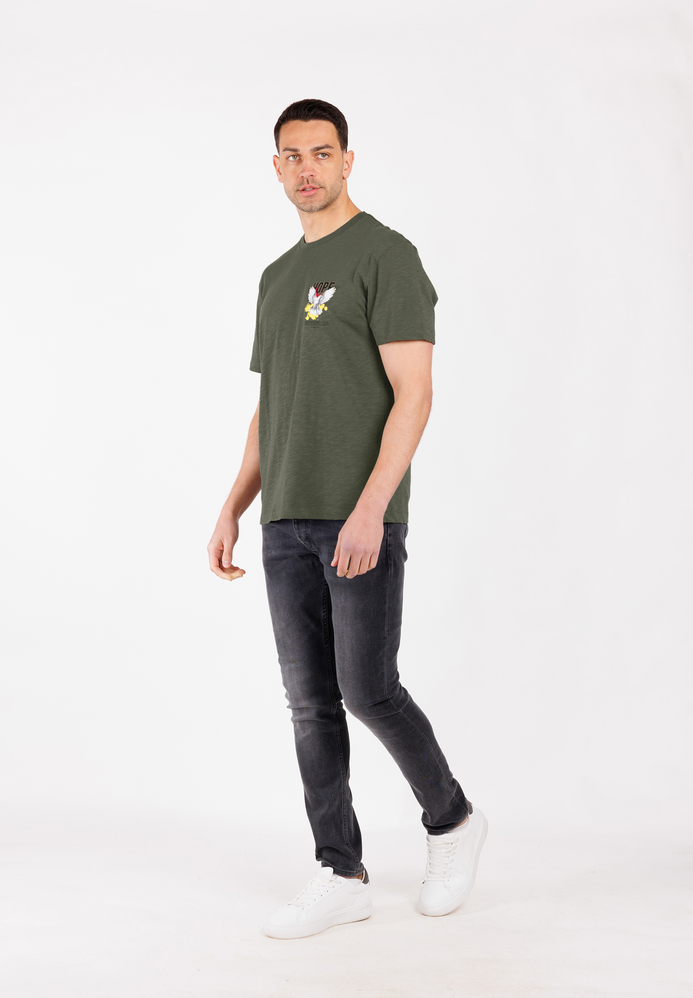 - Design: Klassisches Rundhals-T-Shirt mit ansprechenden Prints auf der Brust und Rücken, der das Design abrundet und dem Shirt eine besondere Note verleiht.