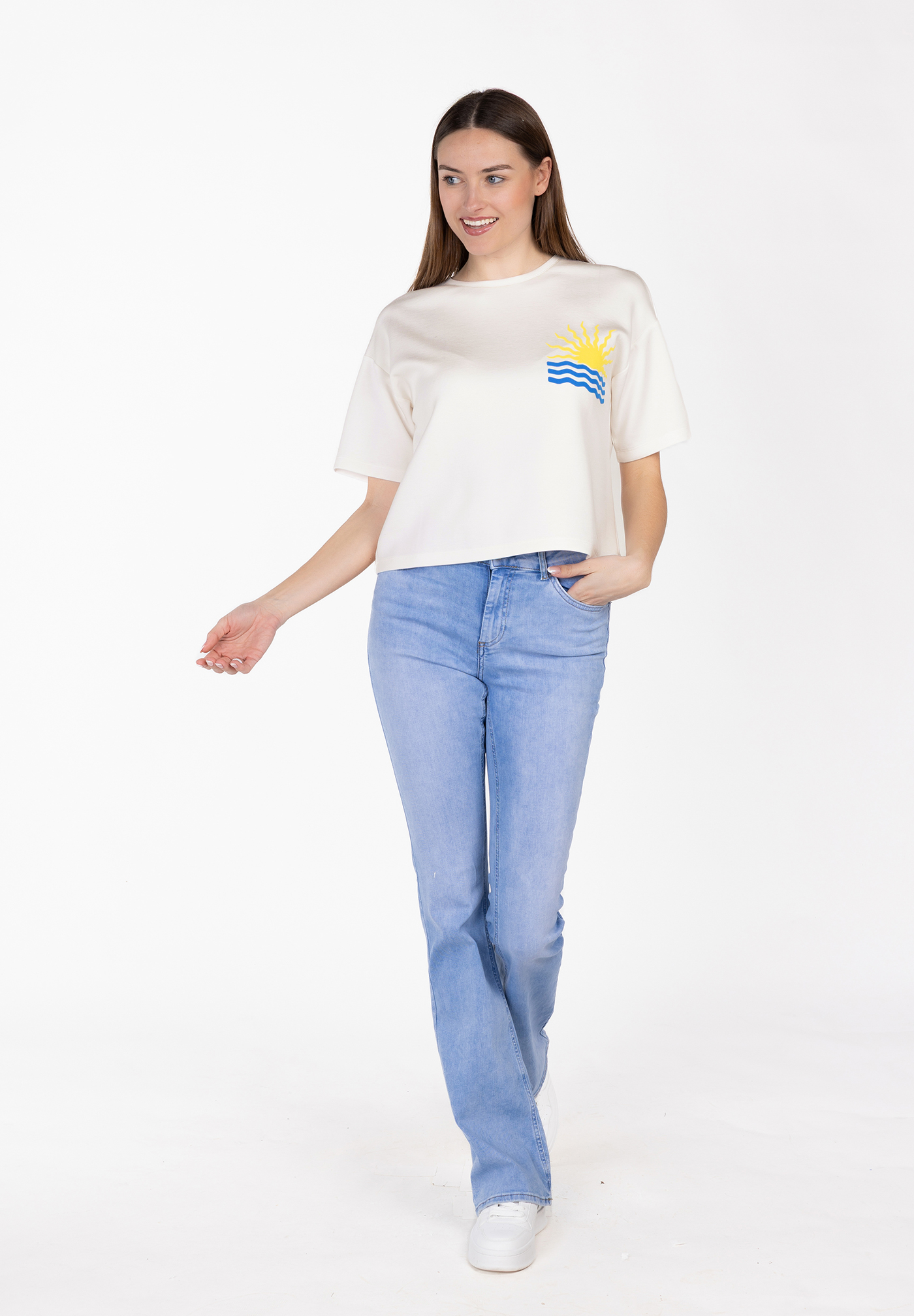 Das weiße T-Shirt kombiniert ein cleanes, modernes Design mit sommerlichen Grafiken: