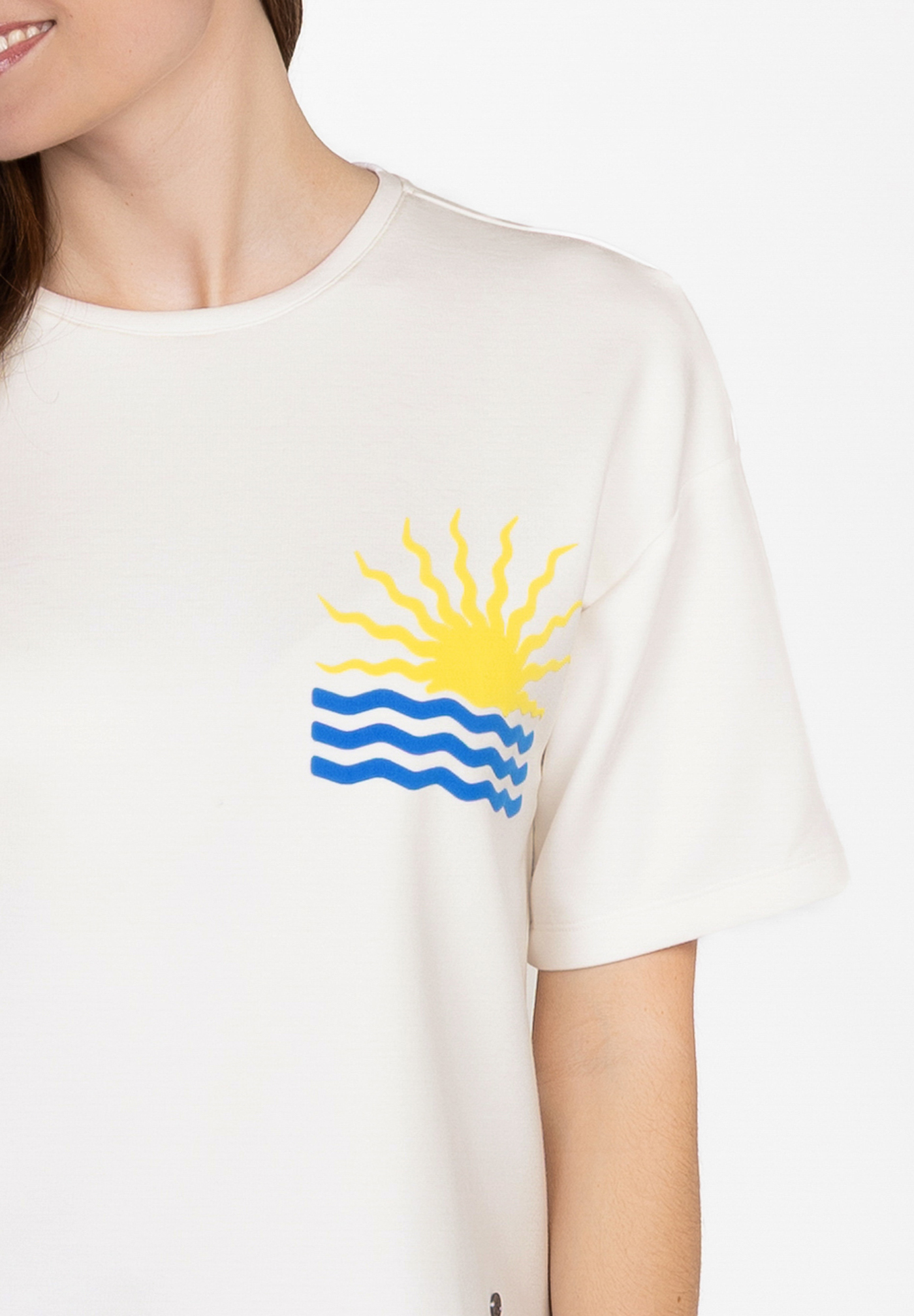 - Frontprint in Brusttaschen-Optik: Kleine Sonne-Wellen-Grafik wirkt frisch und modern.
