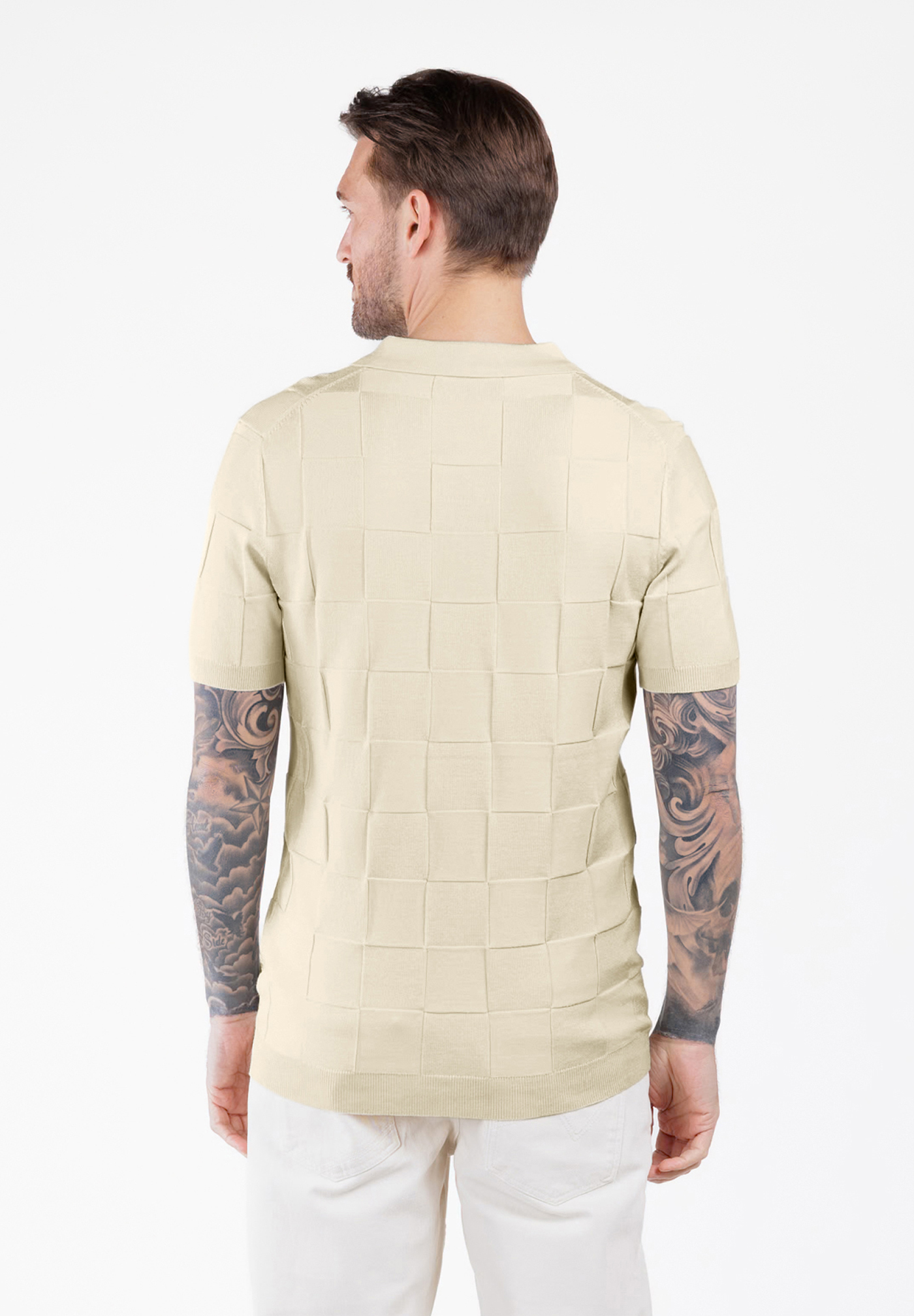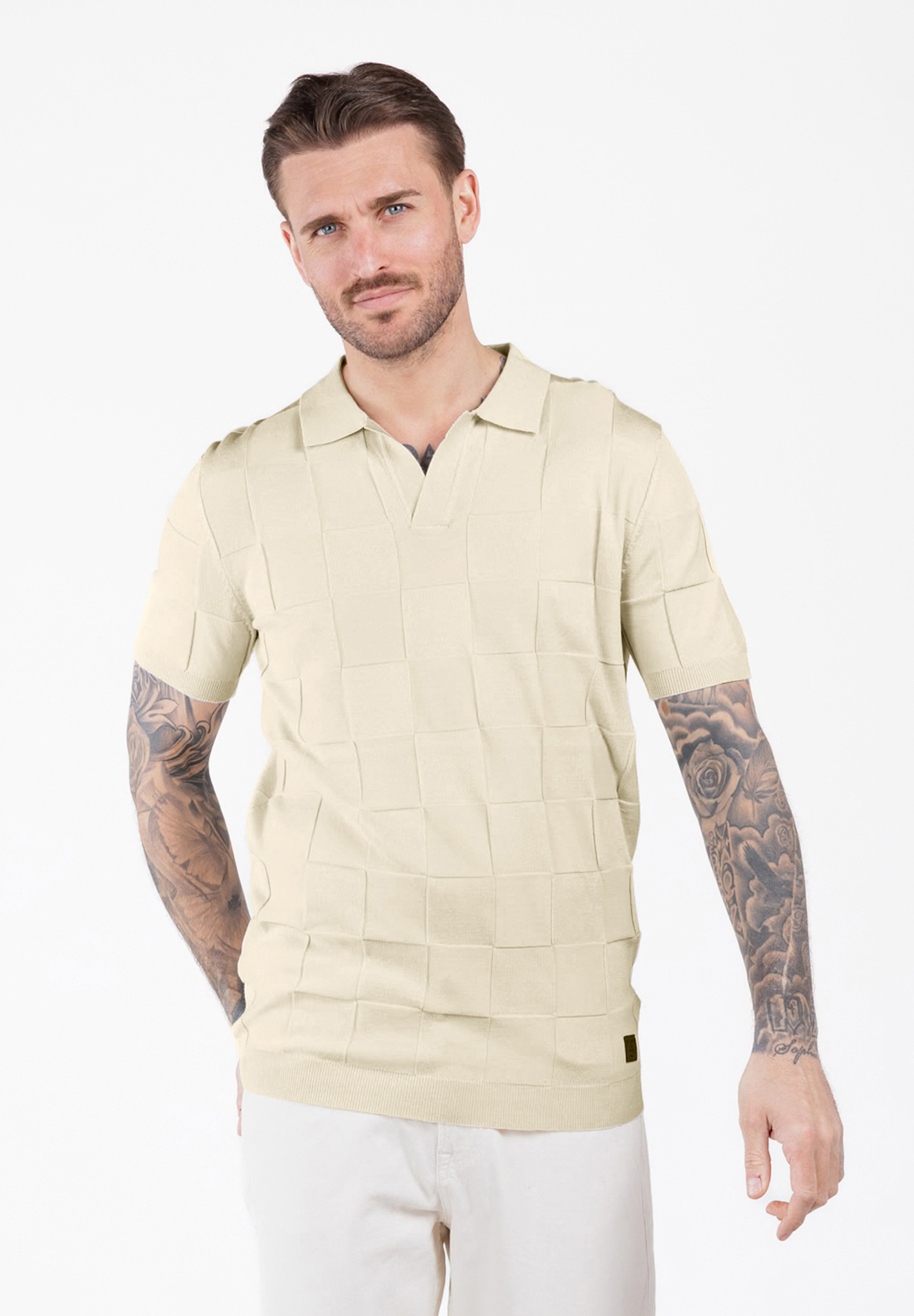 Die hochwertige Strickstruktur mit quadratischem Muster sorgt für einen modernen Look, während der