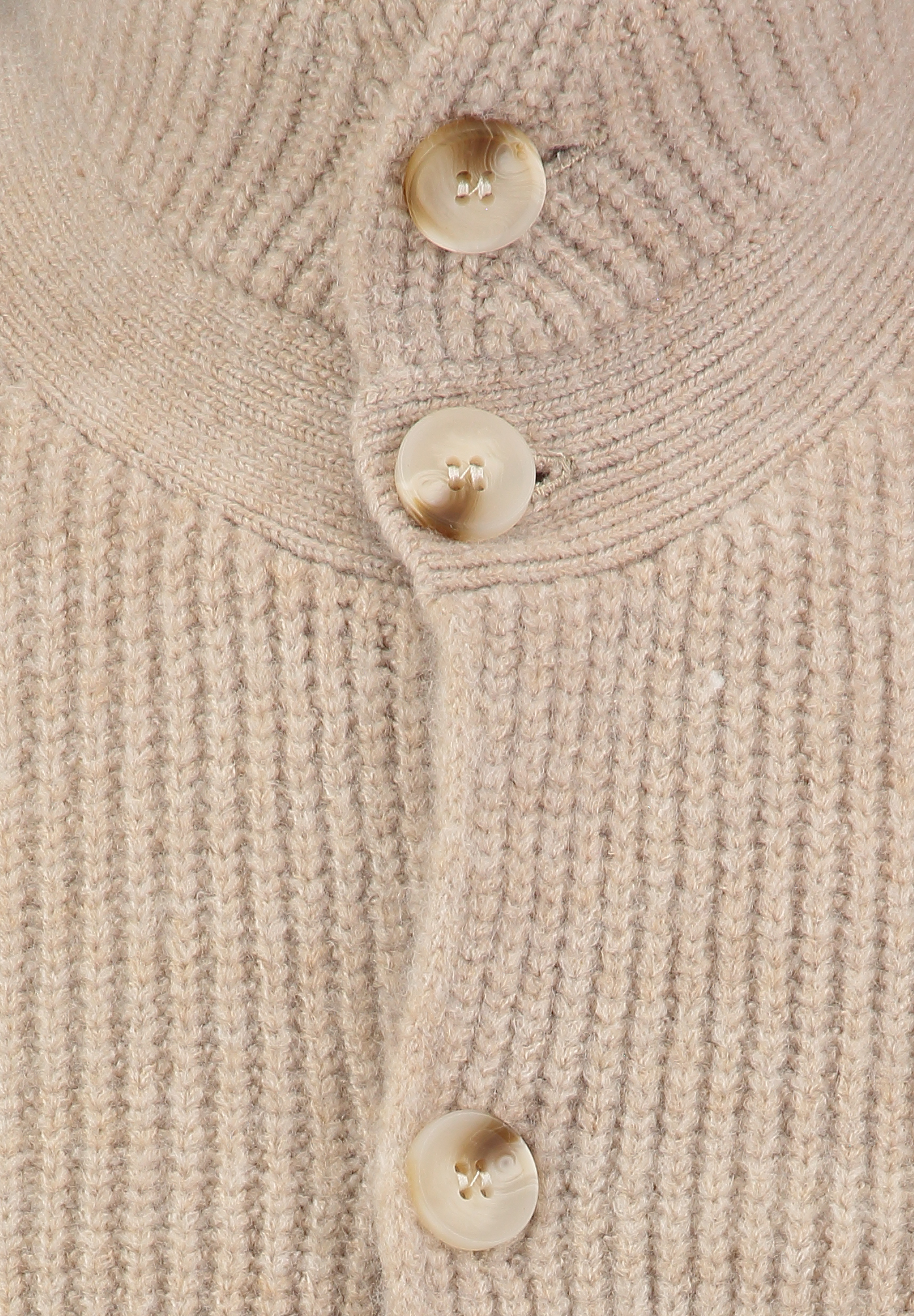 - Design: Die Jacke zeichnet sich durch ein minimalistisches, aber ansprechendes Design mit einem klassischen Kragen und durchgehender Knopfleiste aus. Die dezente Stricktextur fügt eine raffinierte Note hinzu.