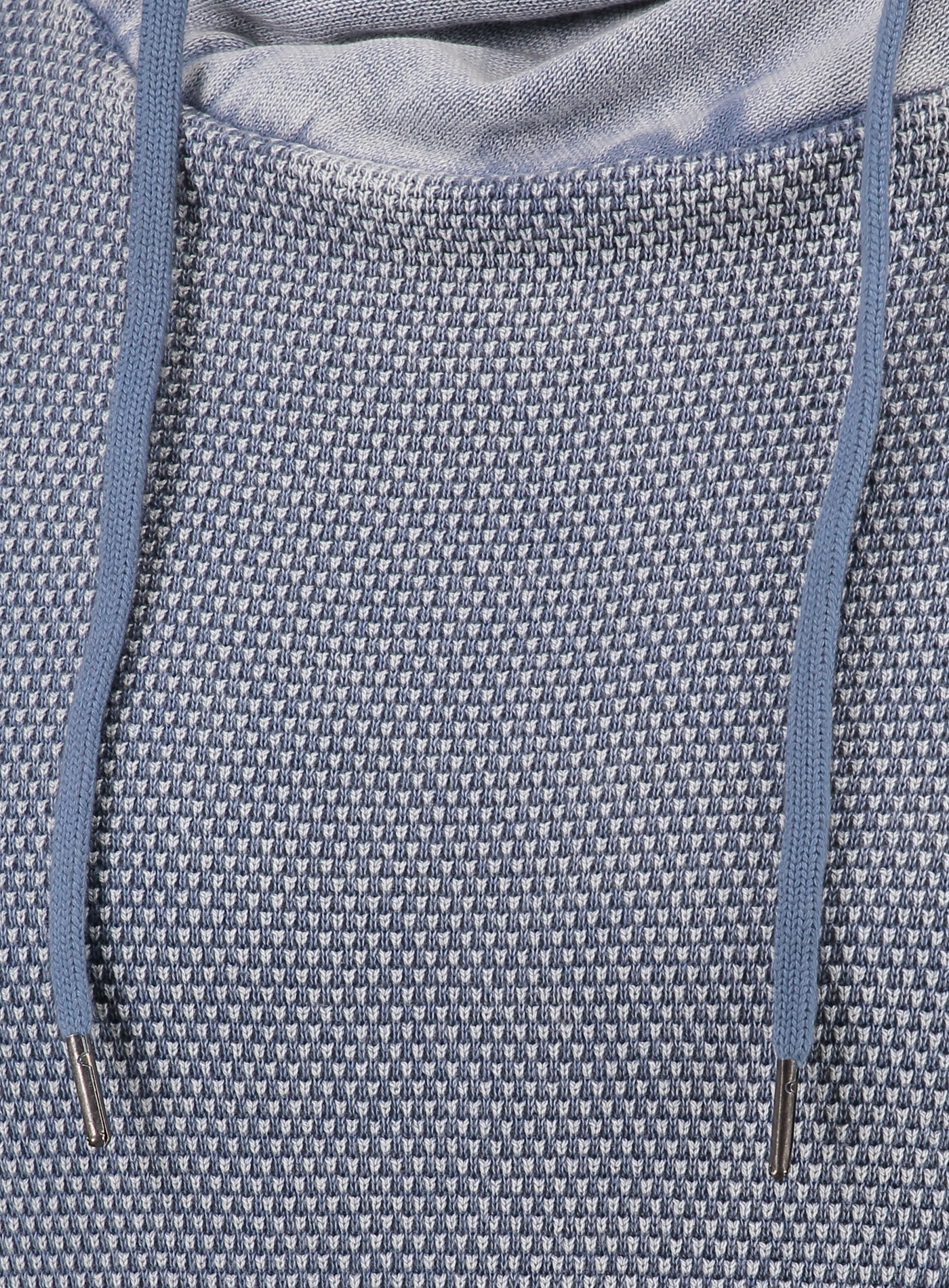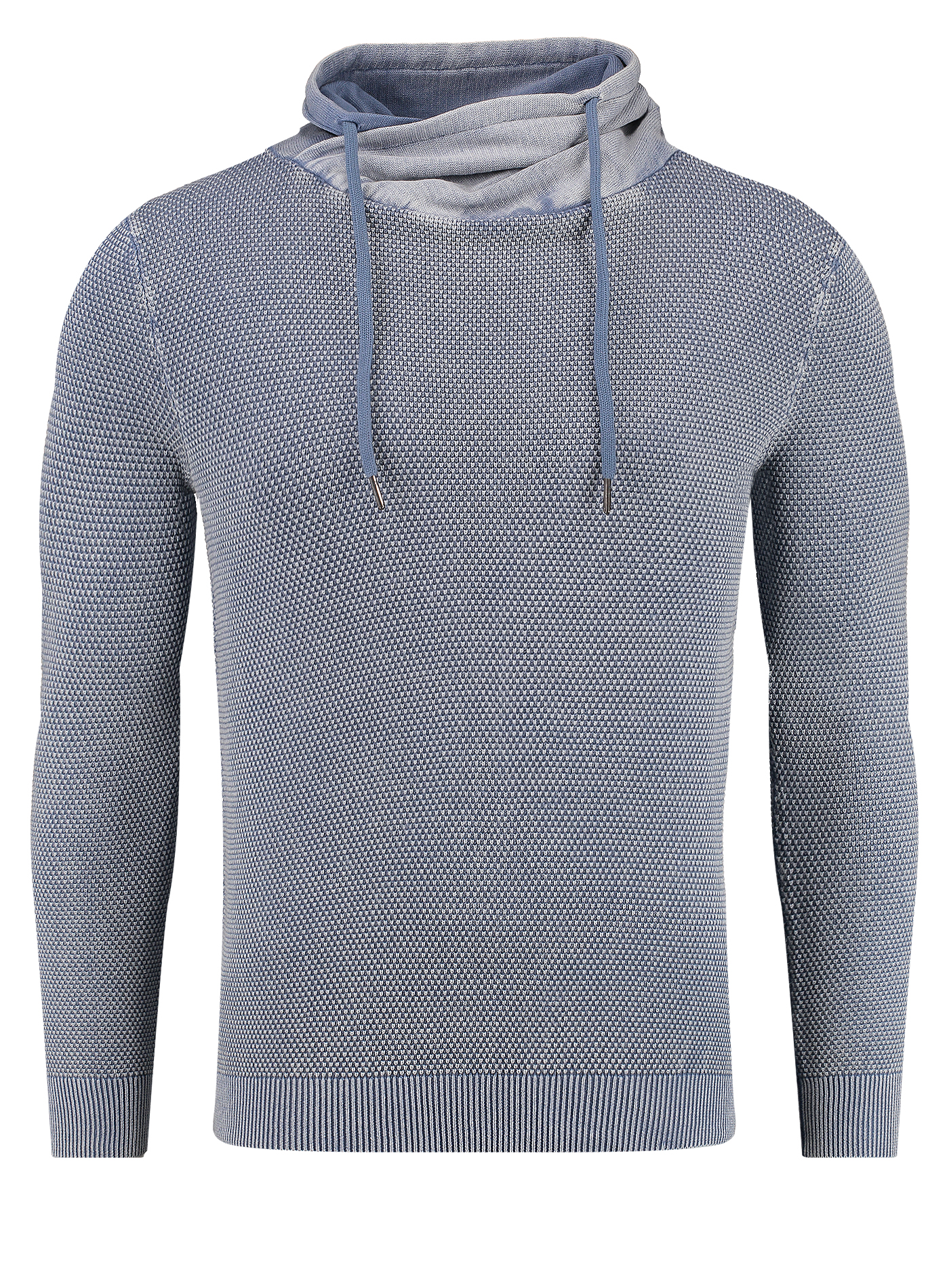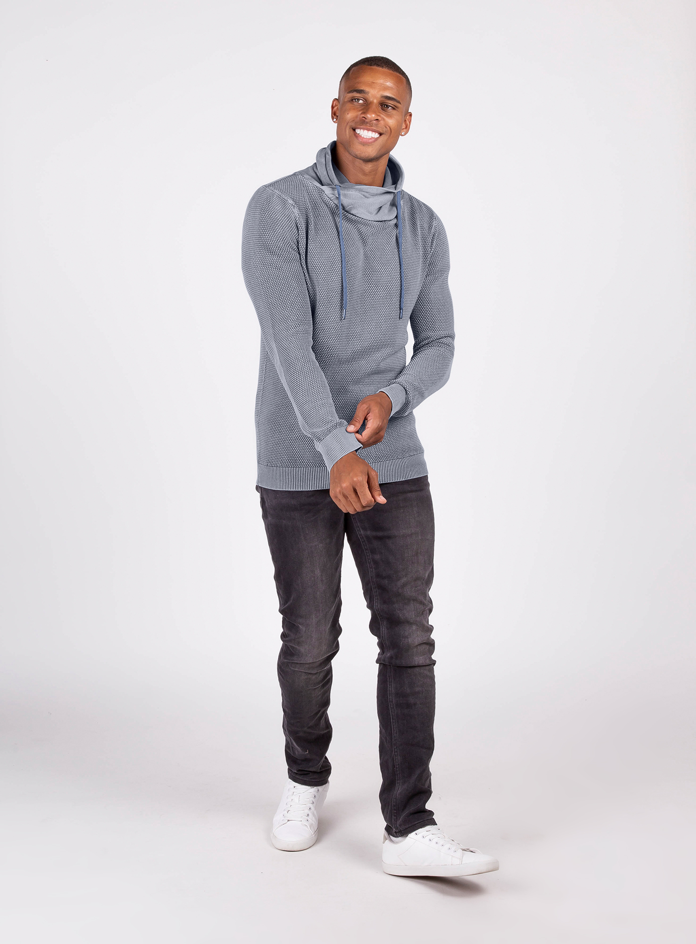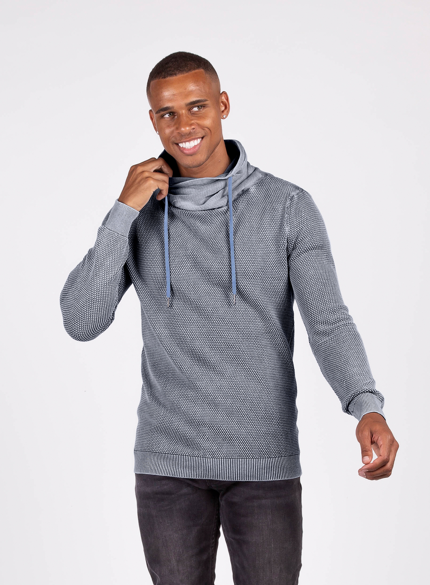 vorne an eine Kapuze erinnert und genauso mit einem praktischen Tunnelzug versehen ist.