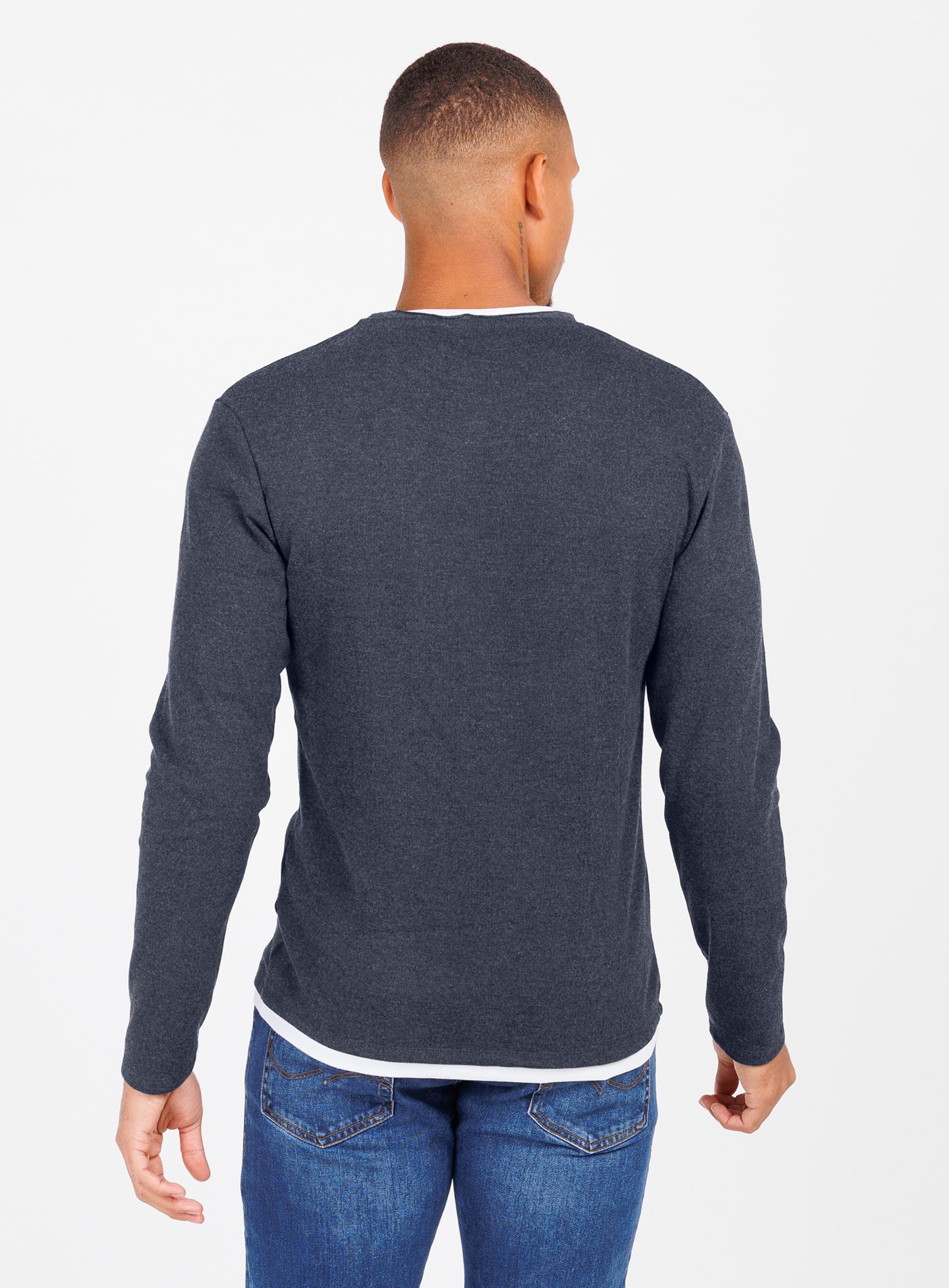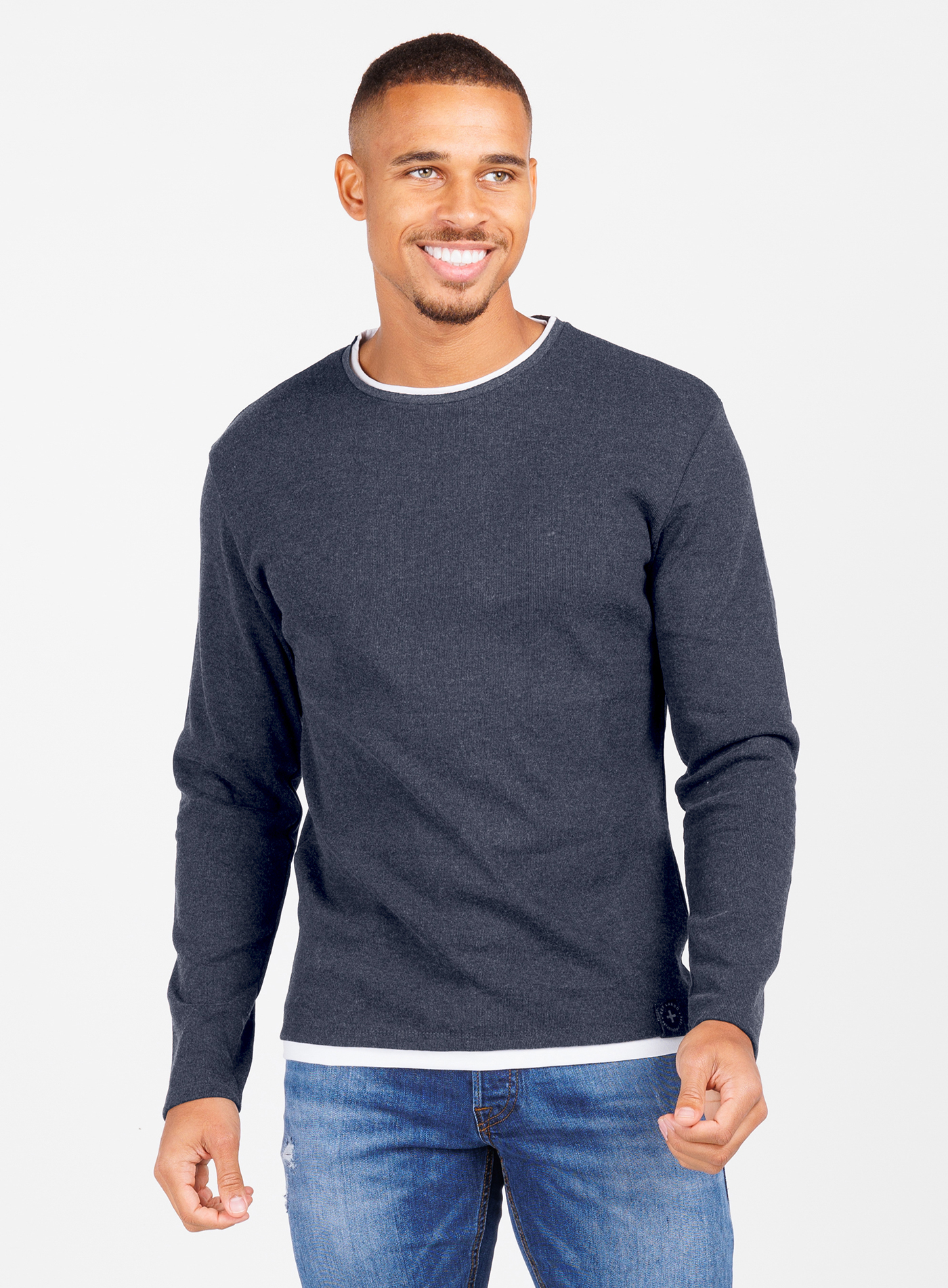 Der coole Pulli für Herren lässt sowohl am Rundhalsausschnitt als auch am Bund einen farblich abgesetzten Stoff hervorblitzen, wodurch ein moderner Layer-Look erzeugt wird.