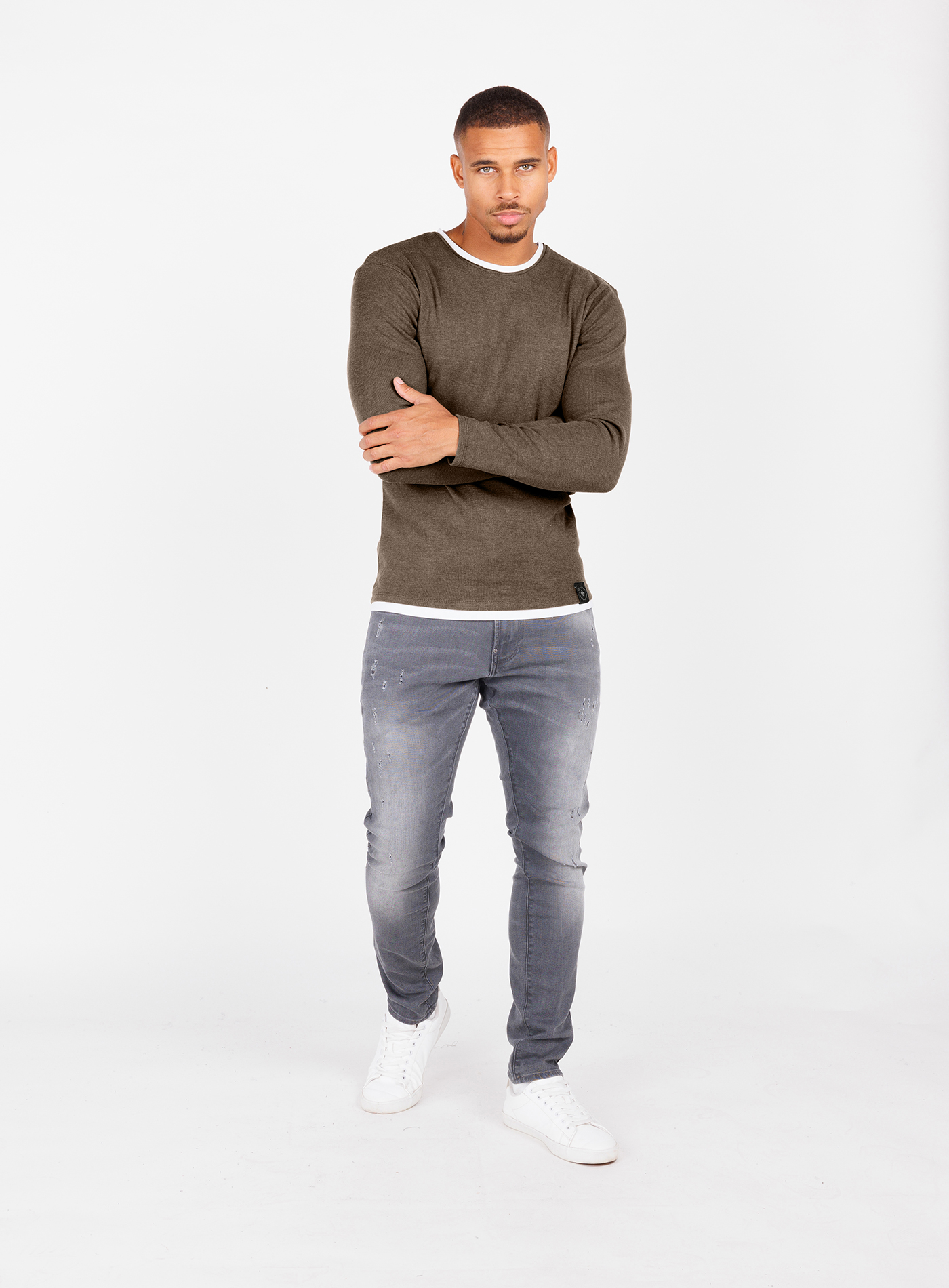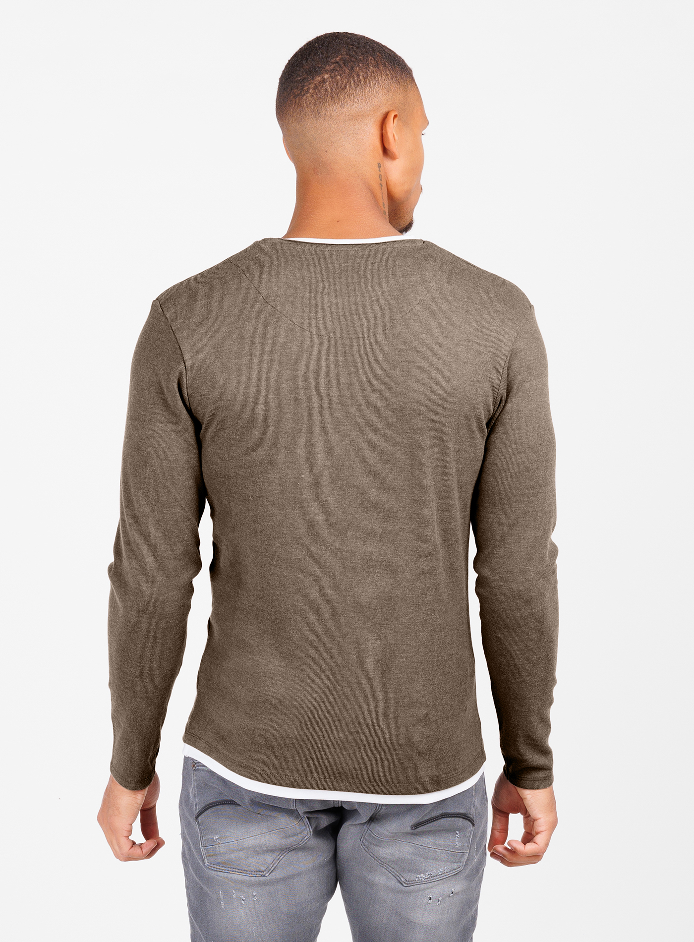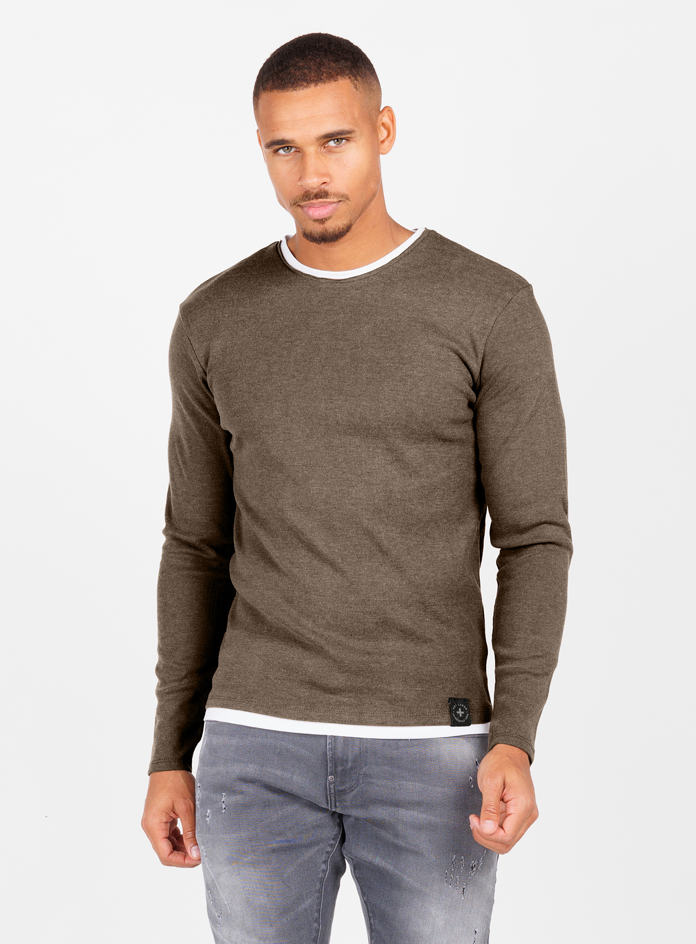 Der coole Pulli für Herren lässt sowohl am Rundhalsausschnitt als auch am Bund einen farblich abgesetzten Stoff hervorblitzen, wodurch ein moderner Layer-Look erzeugt wird.