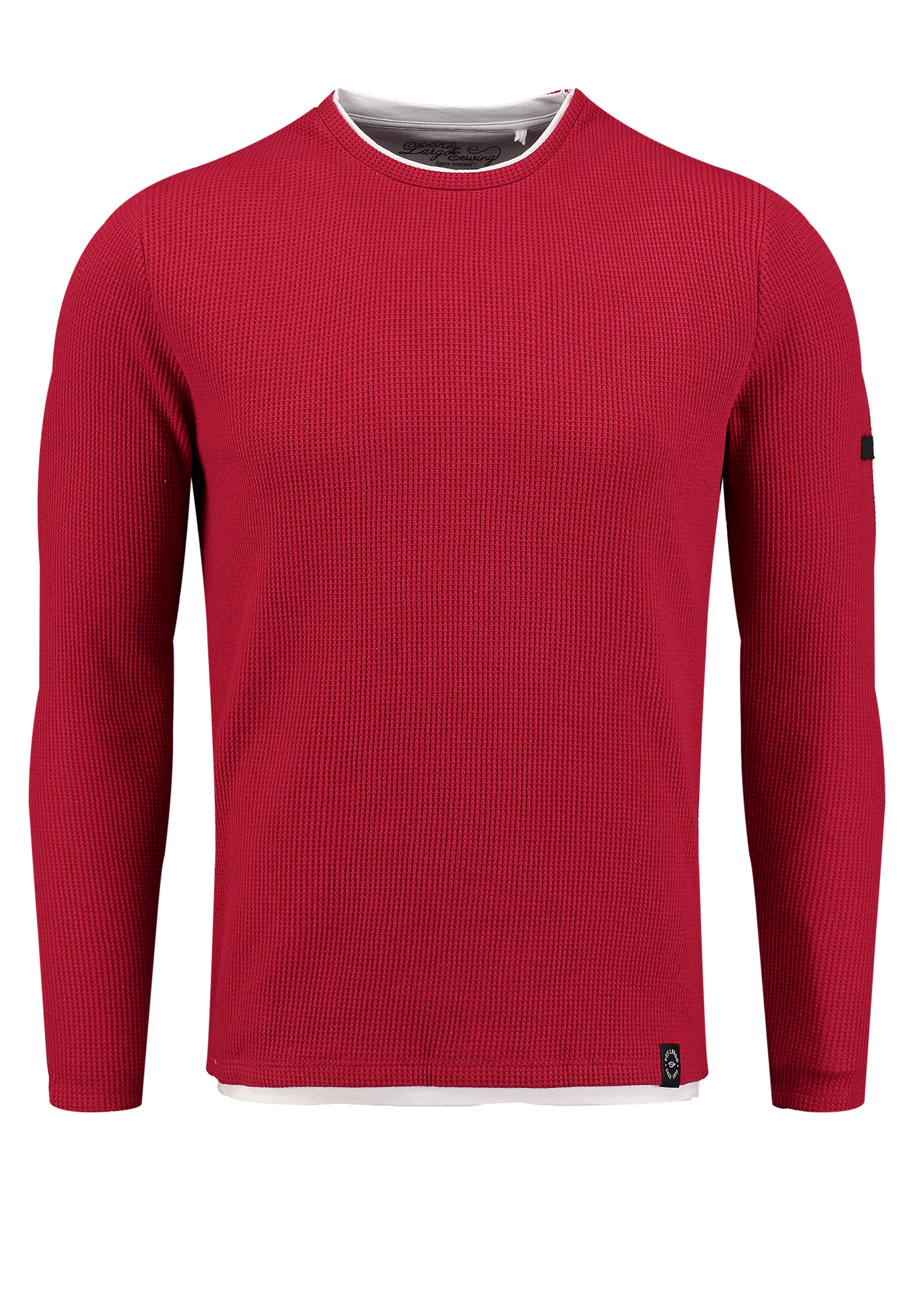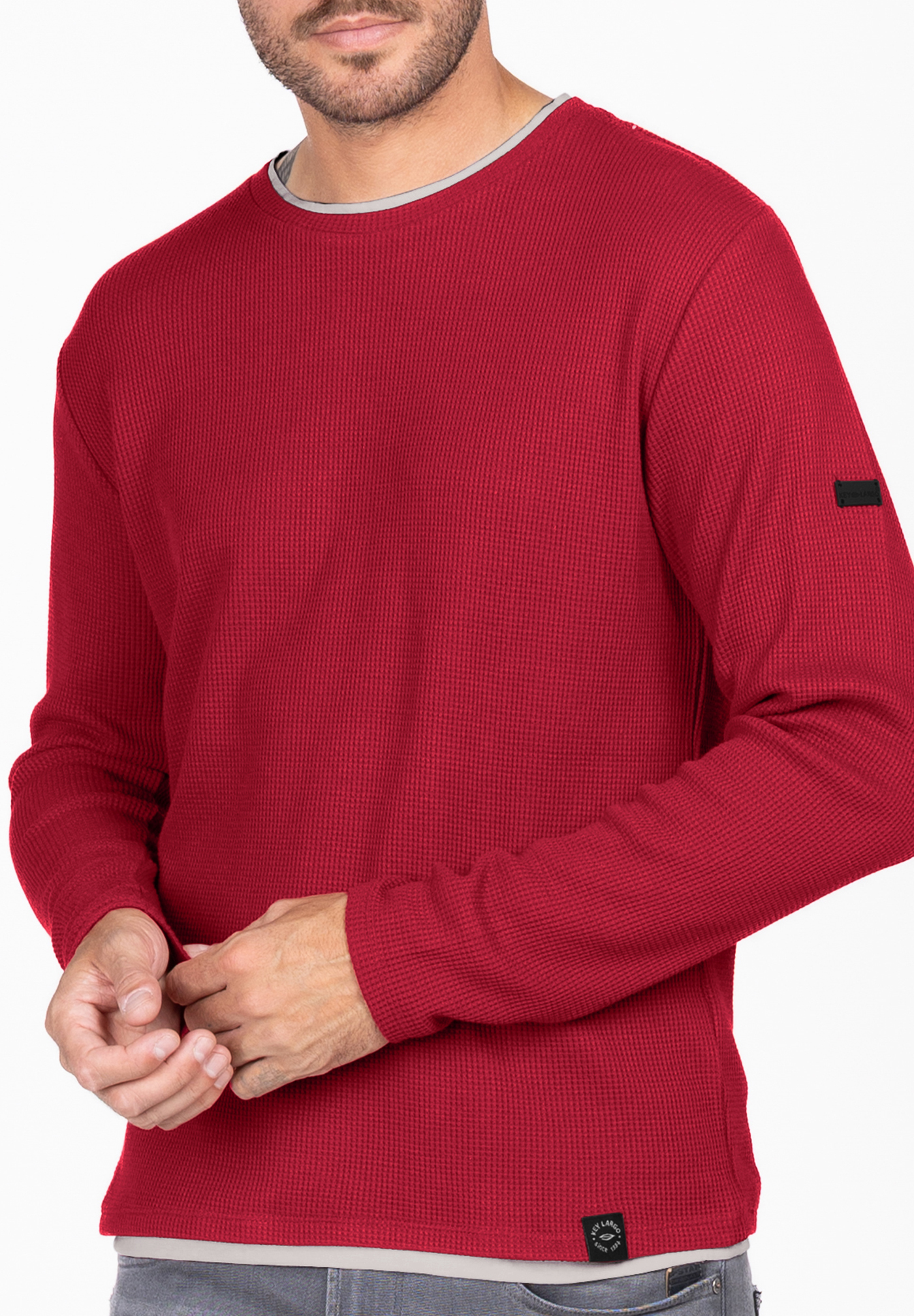 Der coole Pulli für Herren lässt sowohl am Rundhalsausschnitt als auch am Bund einen farblich abgesetzten Stoff hervorblitzen, wodurch ein moderner Layer-Look erzeugt wird.