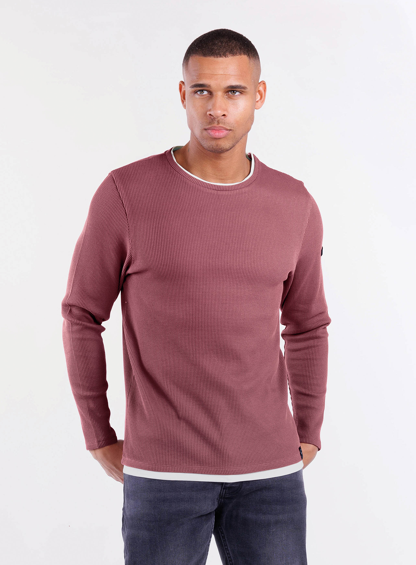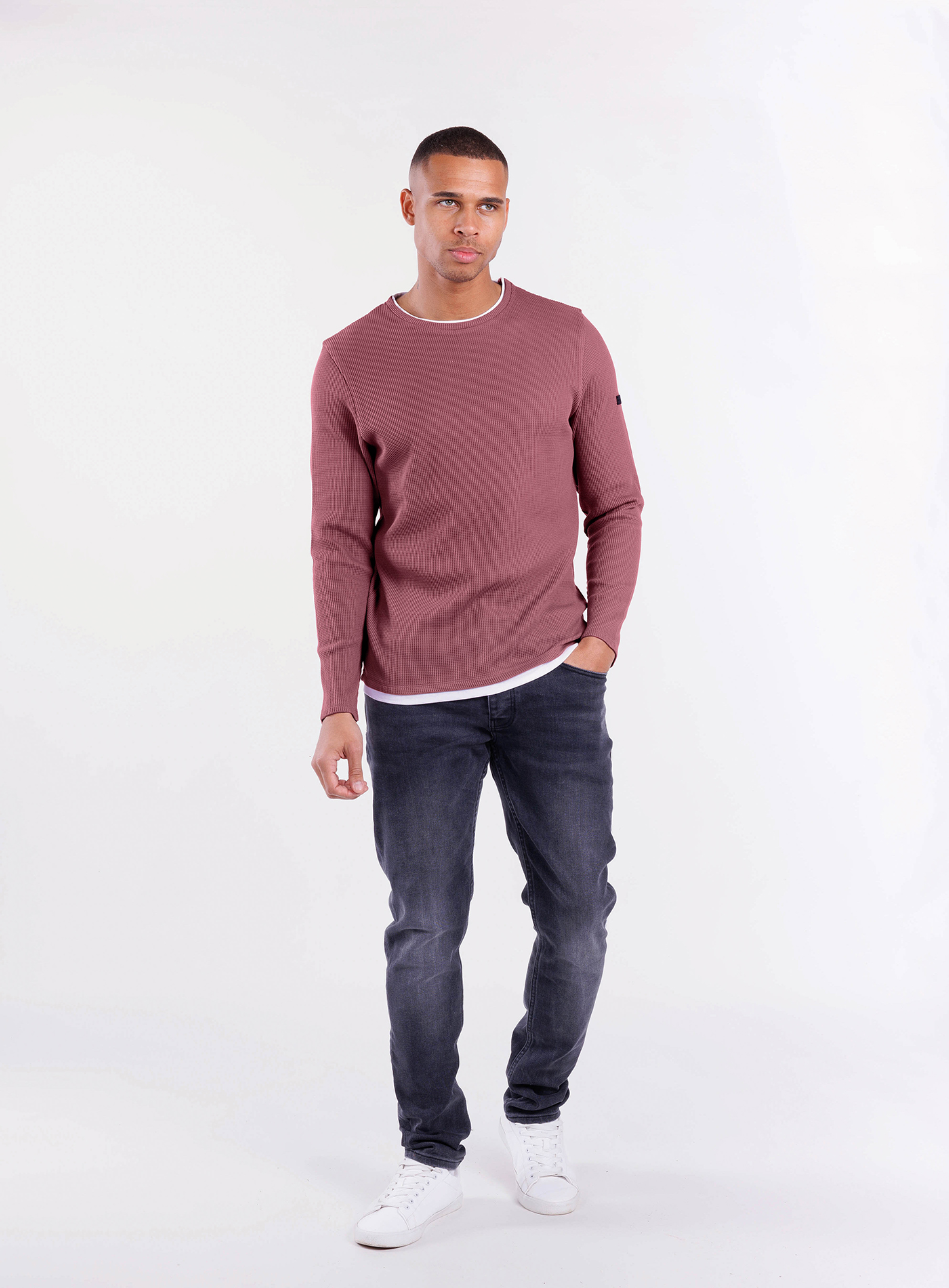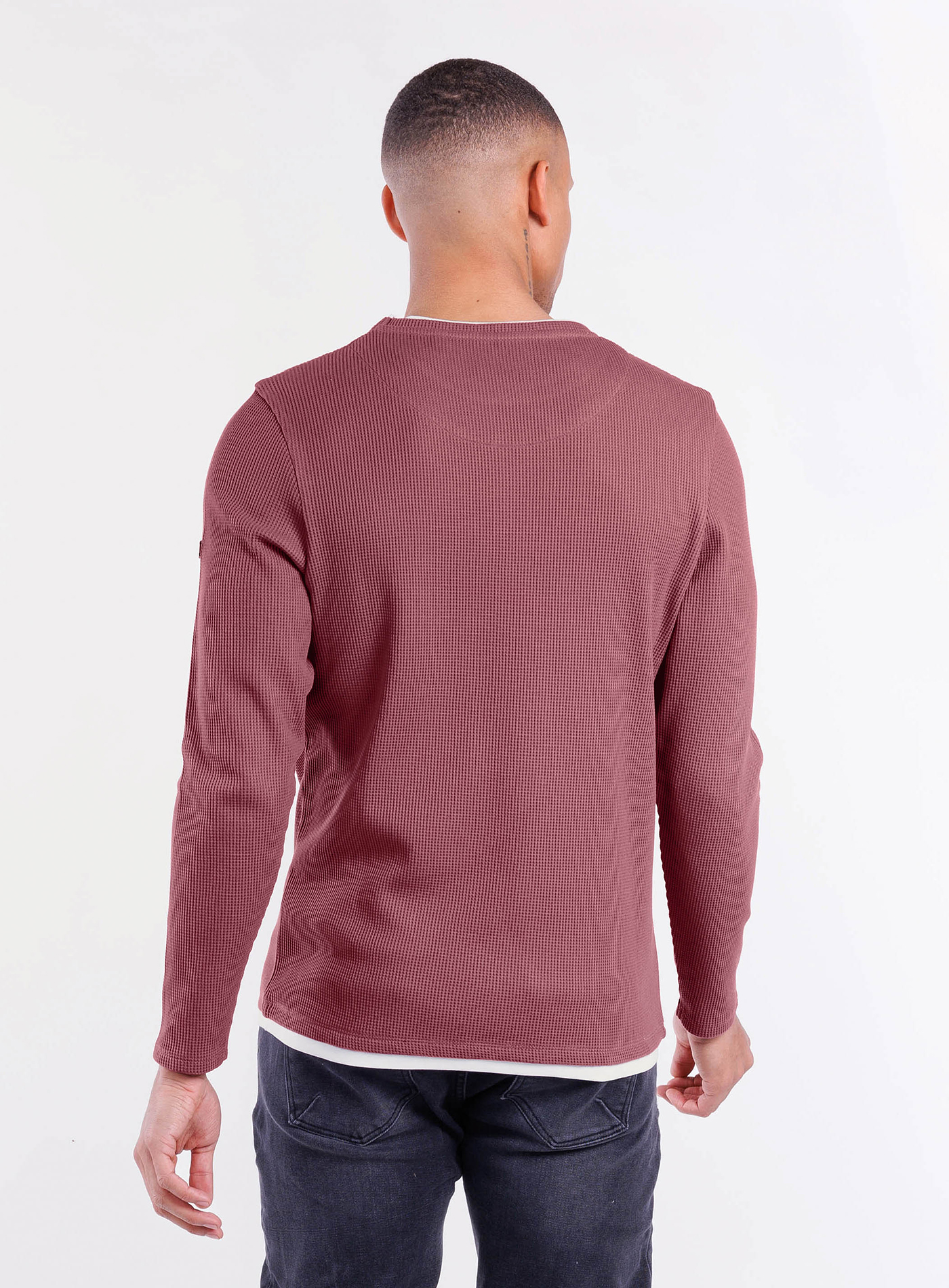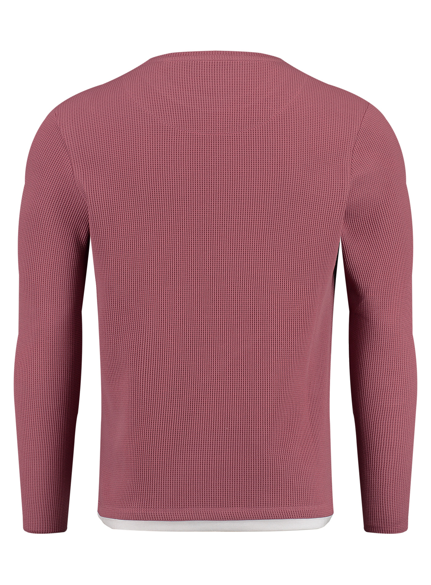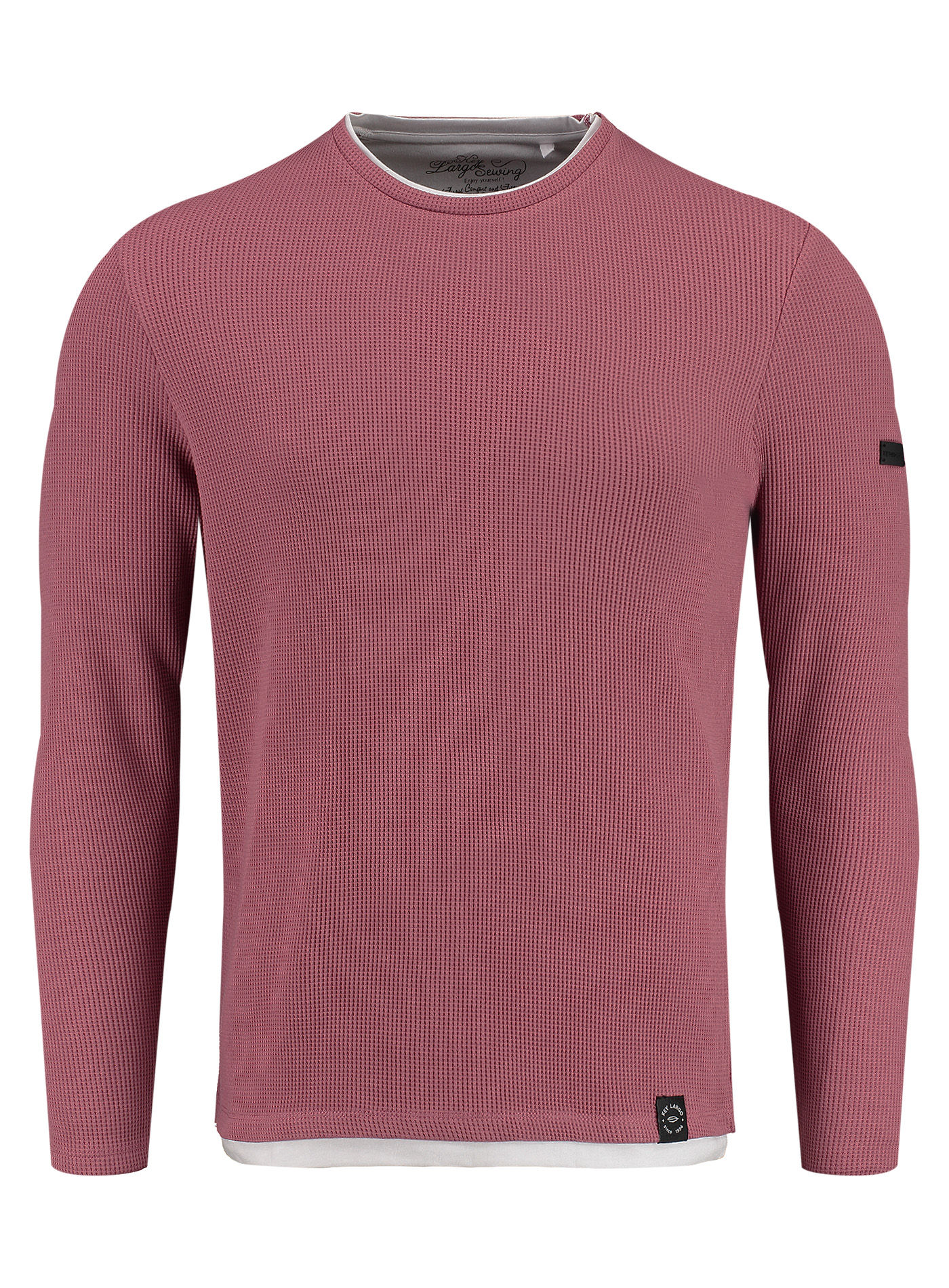 Der coole Pulli für Herren lässt sowohl am Rundhalsausschnitt als auch am Bund einen farblich abgesetzten Stoff hervorblitzen, wodurch ein moderner Layer-Look erzeugt wird.