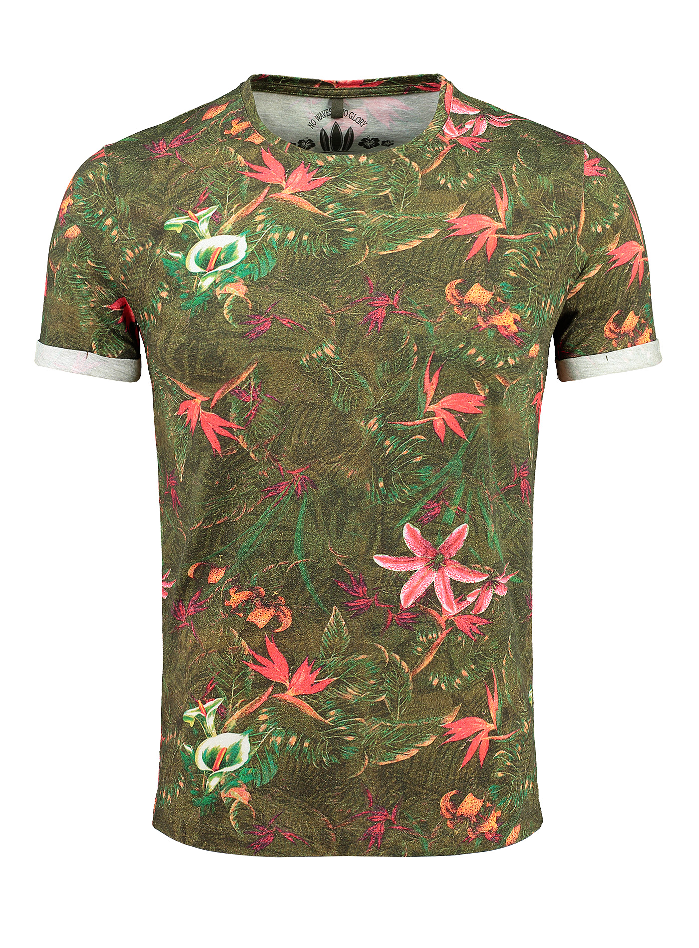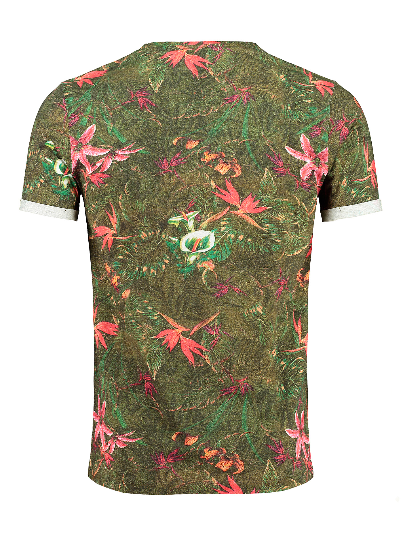 aus üppigen Blättern und farbenfrohen Blumen ein. Dieses Shirt ist in einer Palette von