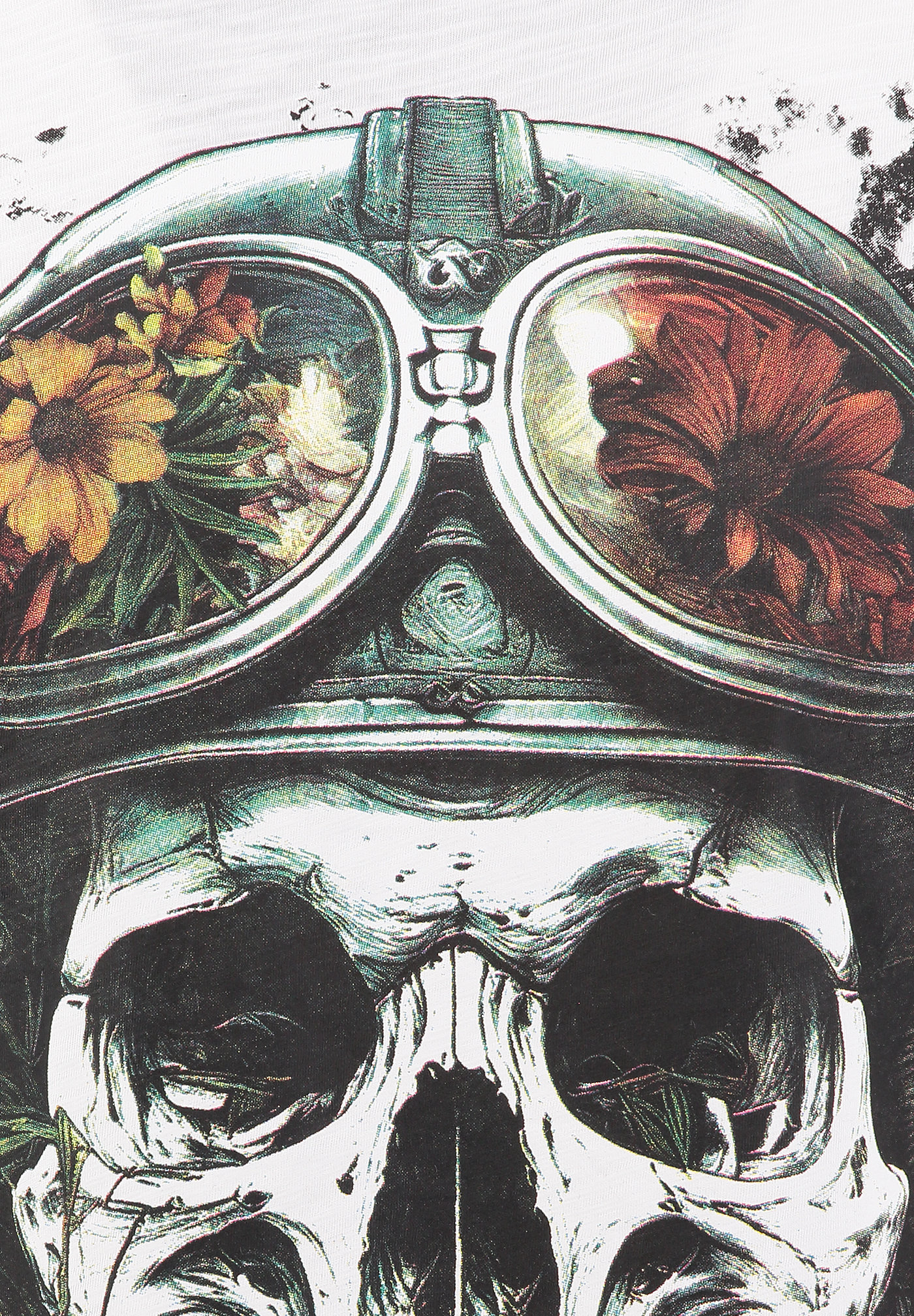Das riesige Skull-Motiv mit Helm und spektakulär gestalteten Goggles erzeugt einen starken, rebellischen Look detailreich, farbig akzentuiert und voller Energie.