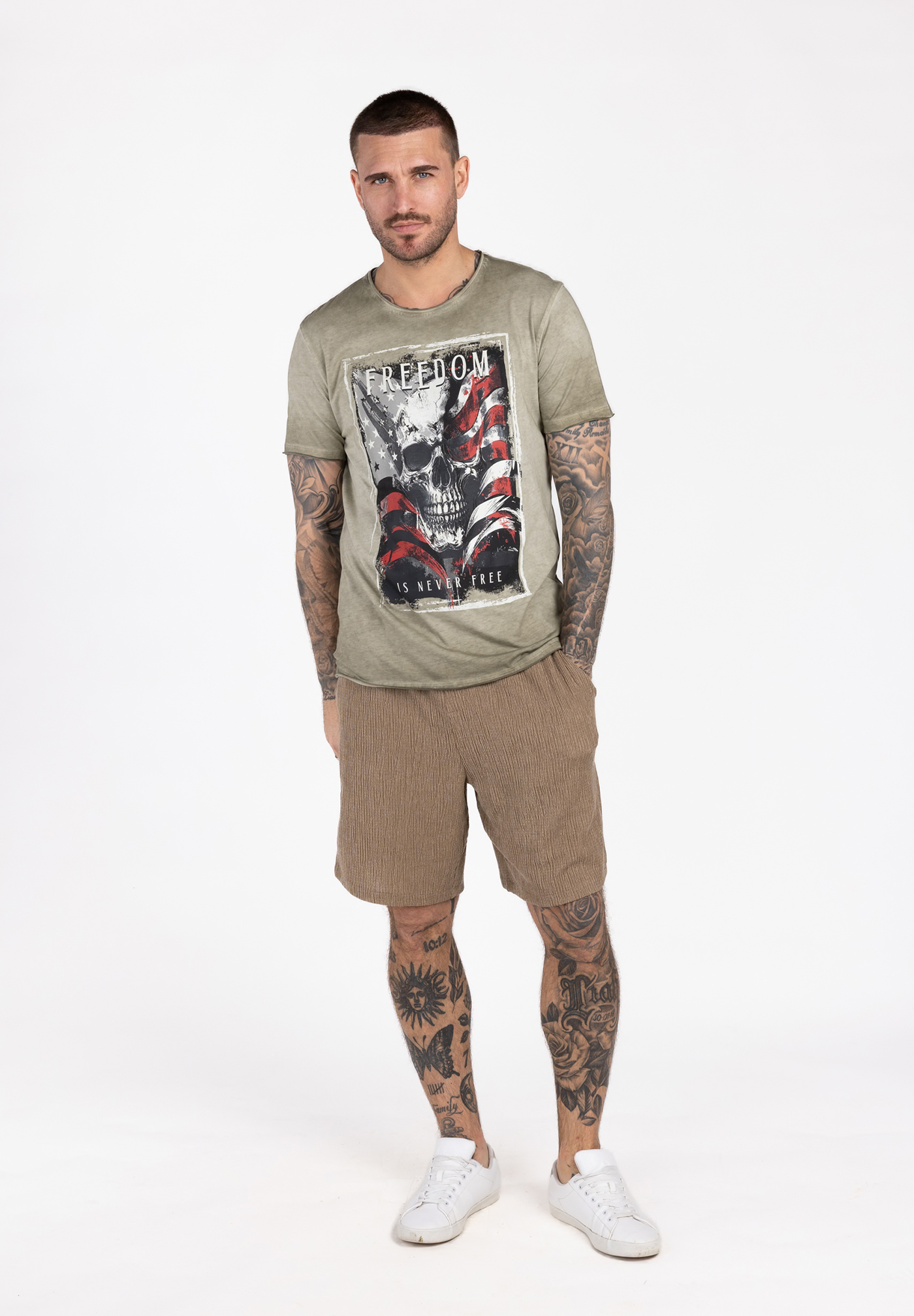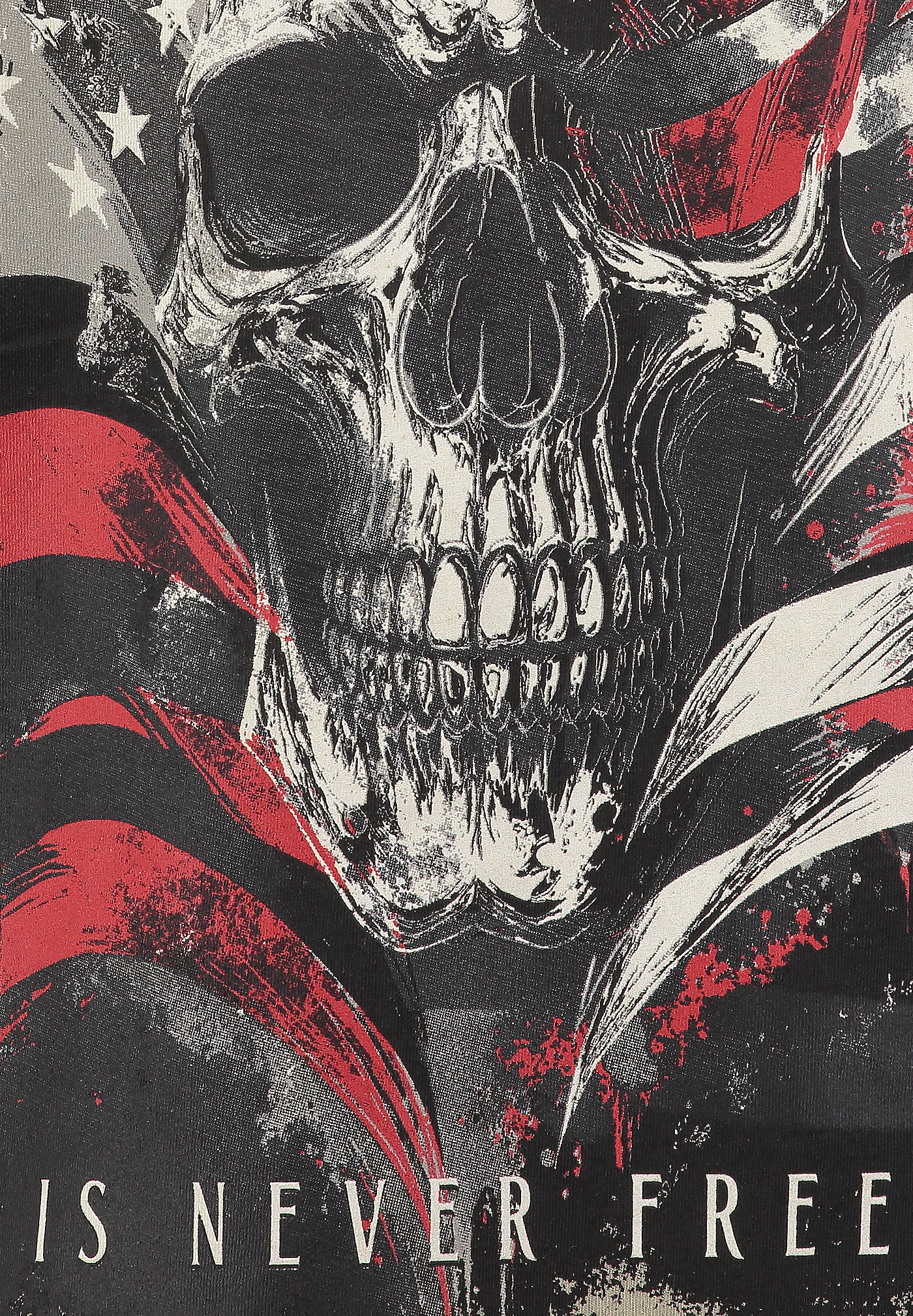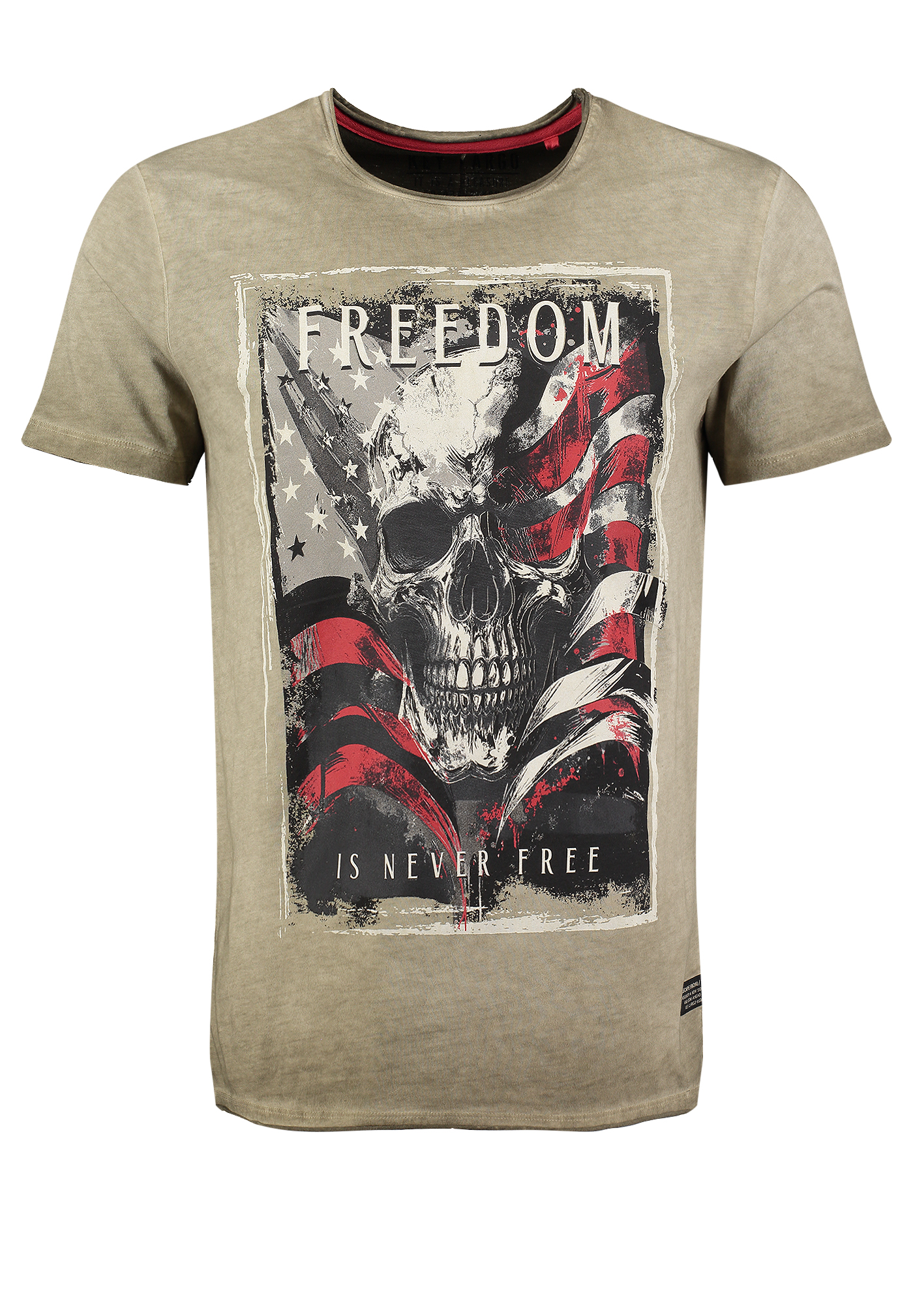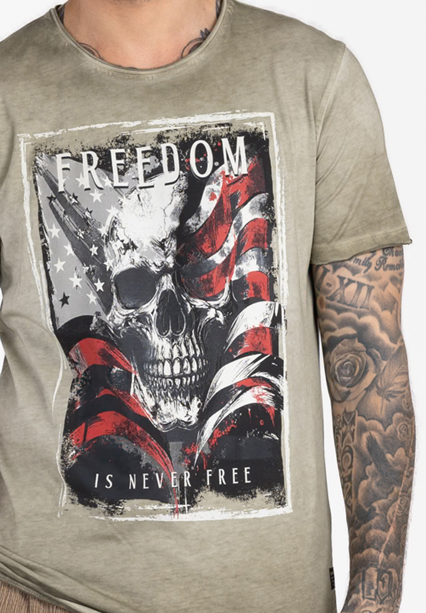 Der Schriftzug FREEDOM IS NEVER FREE unterstreicht die rebellische Botschaft, während der dezente Vintage-Washed-Look