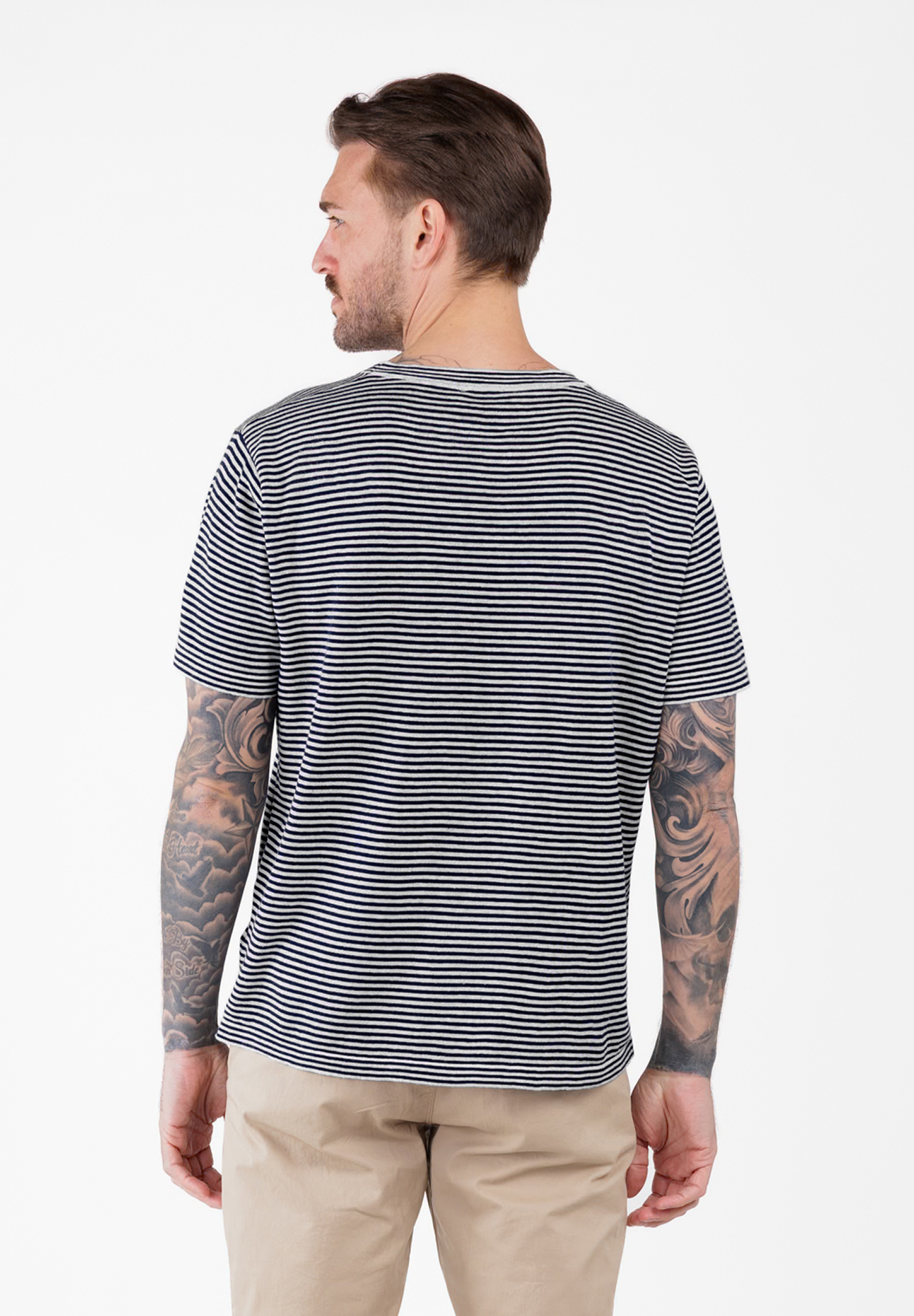 Auge für klassisches Design hat. Mit seinem feinen Streifenmuster und dem kleinen Leder-Patch am Saum