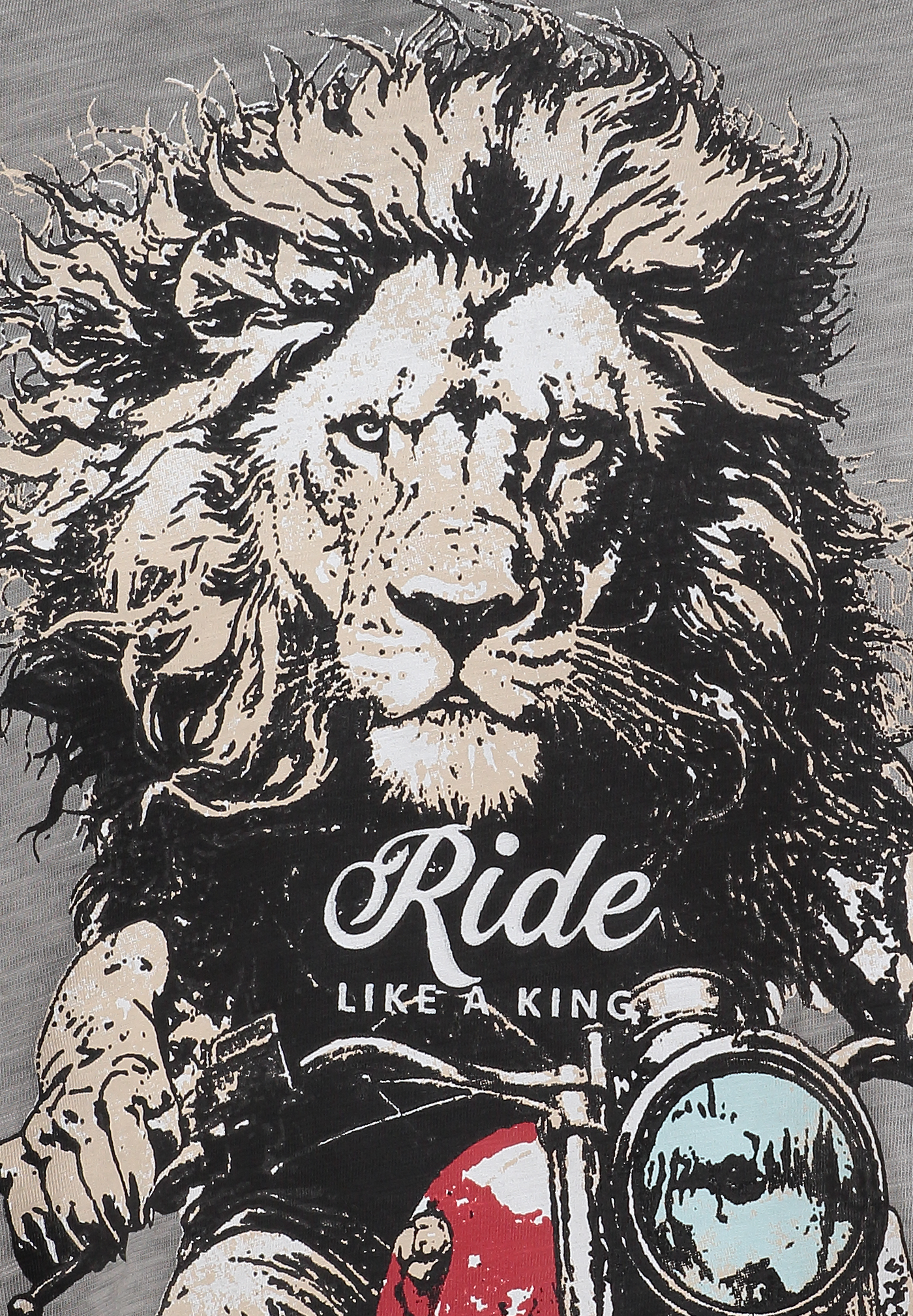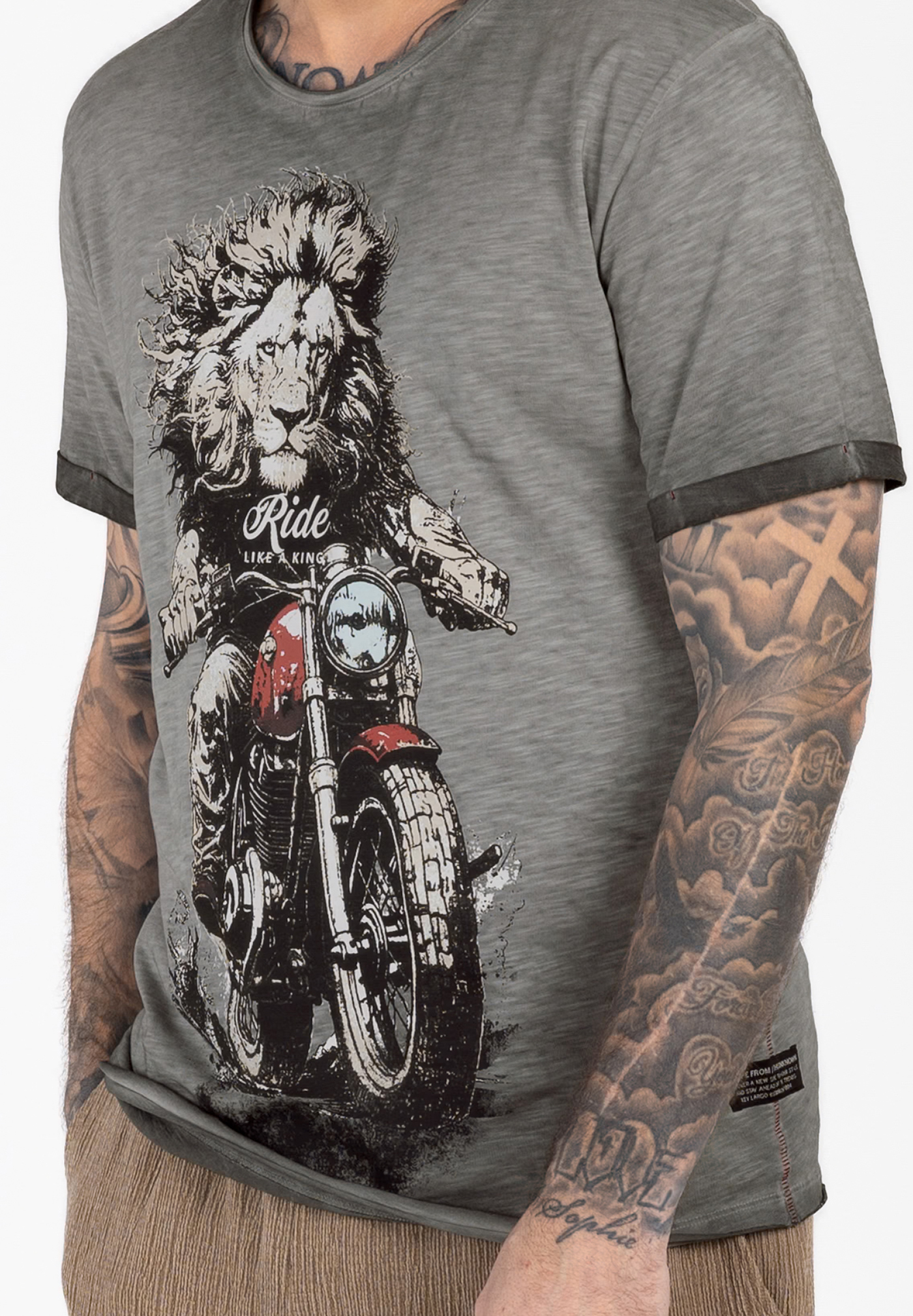 Das T-Shirt zeigt einen eindrucksvollen Löwen, der auf einem Motorrad sitzt ein Motiv voller Stärke, Mut und Dynamik.