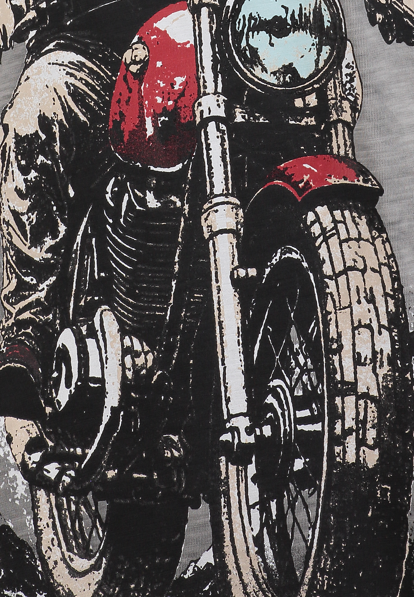 Die Illustration ist kunstvoll ausgearbeitet, mit farbigen Akzenten am Bike und einer großzügigen Platzierung