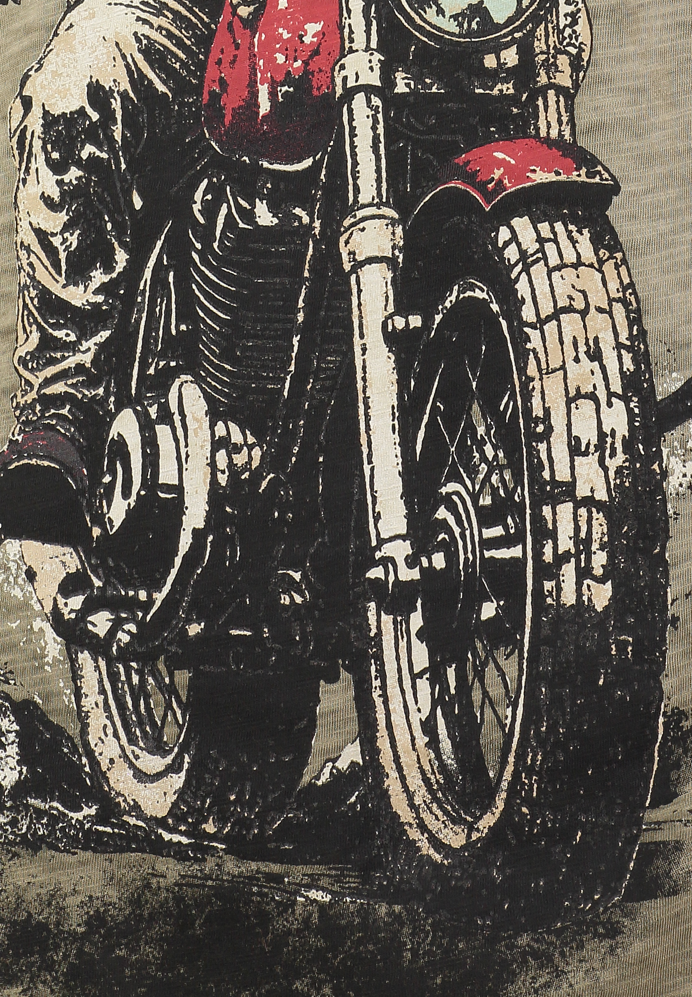 Die Illustration ist kunstvoll ausgearbeitet, mit farbigen Akzenten am Bike und einer großzügigen Platzierung