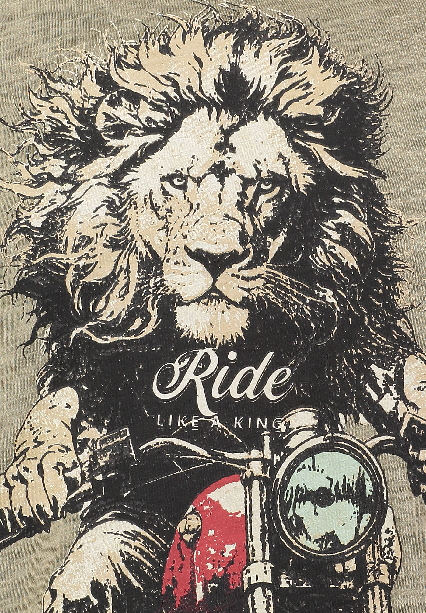 Das T-Shirt zeigt einen eindrucksvollen Löwen, der auf einem Motorrad sitzt ein Motiv voller Stärke, Mut und Dynamik.