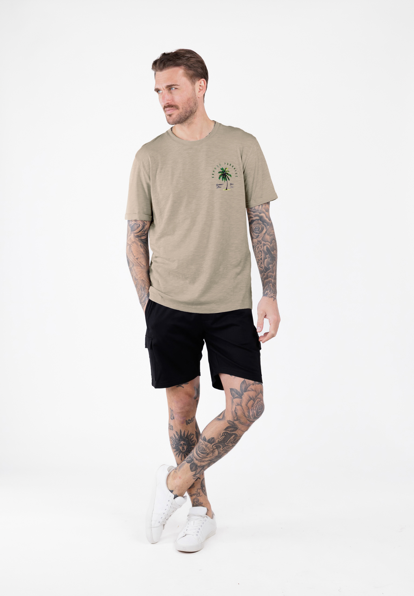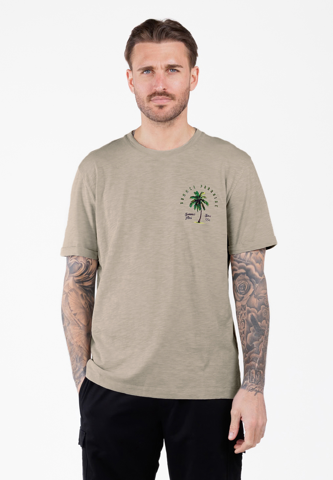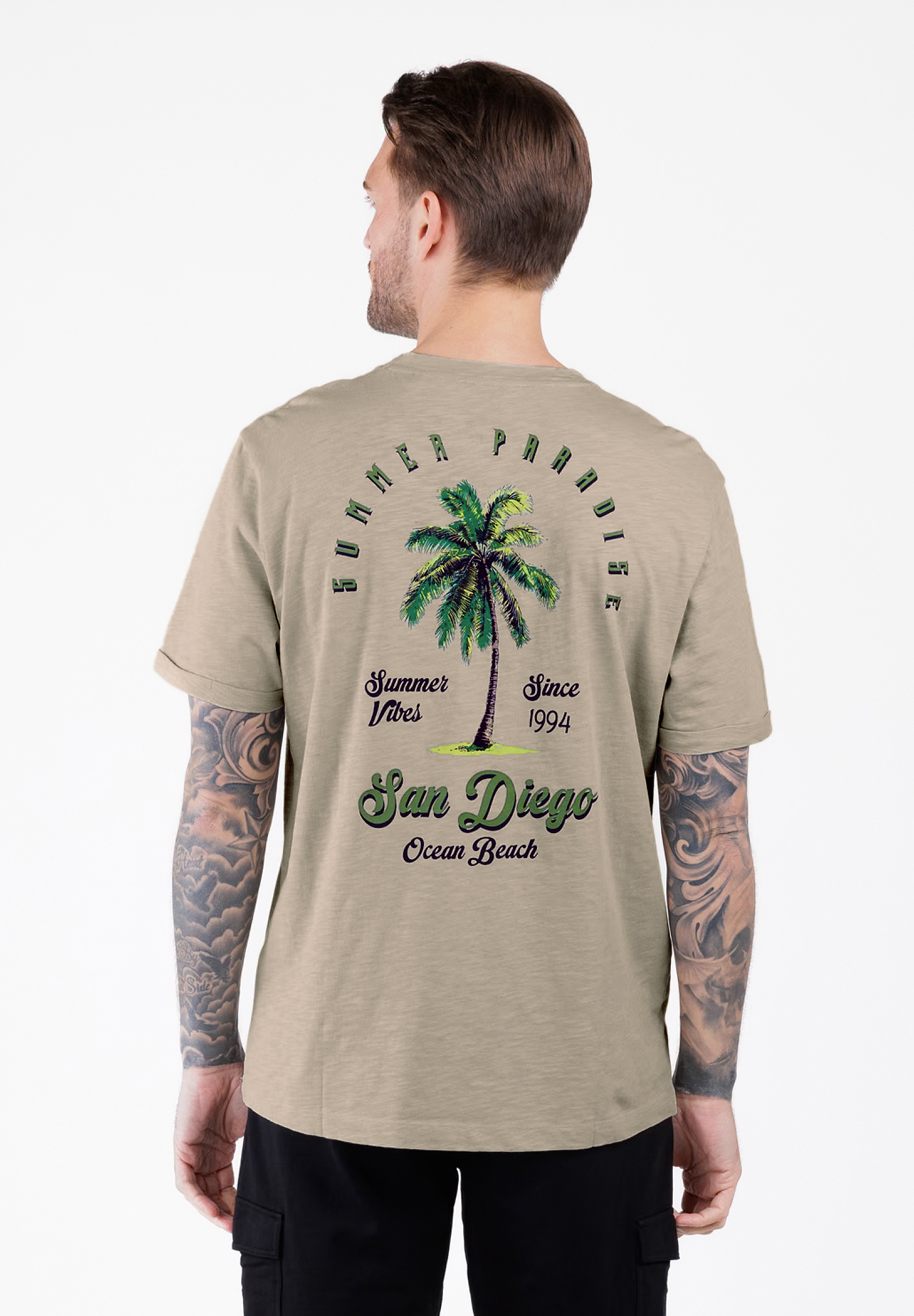 - Design: Klassisches Rundhals-T-Shirt mit ansprechenden Prints auf der Brust und Rücken, der das Design abrundet und dem Shirt eine besondere Note verleiht.