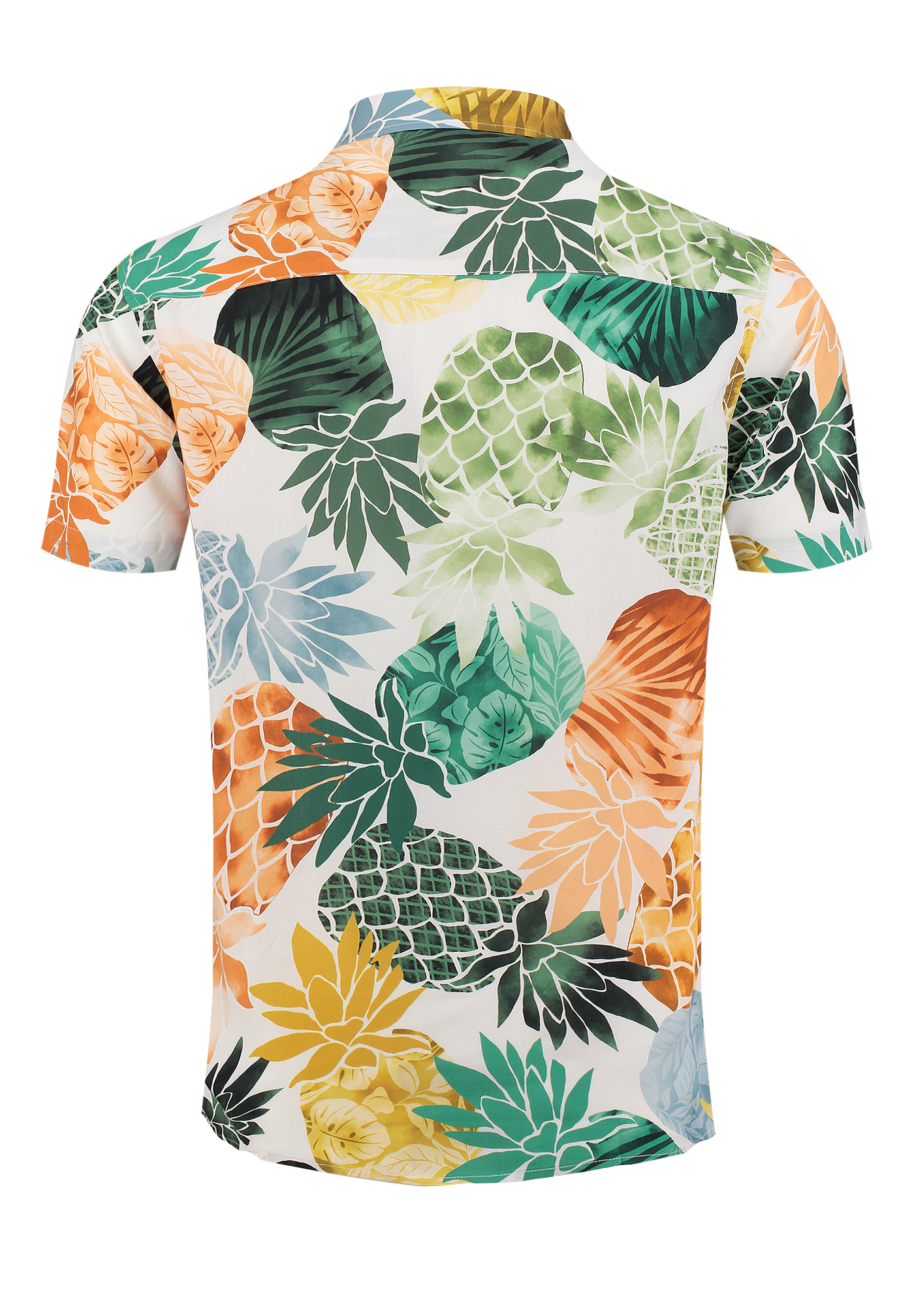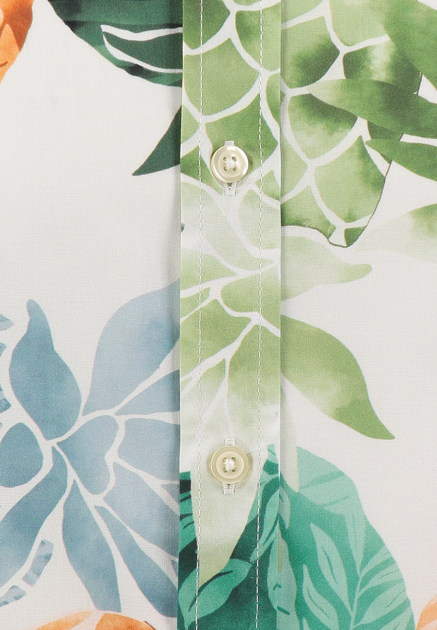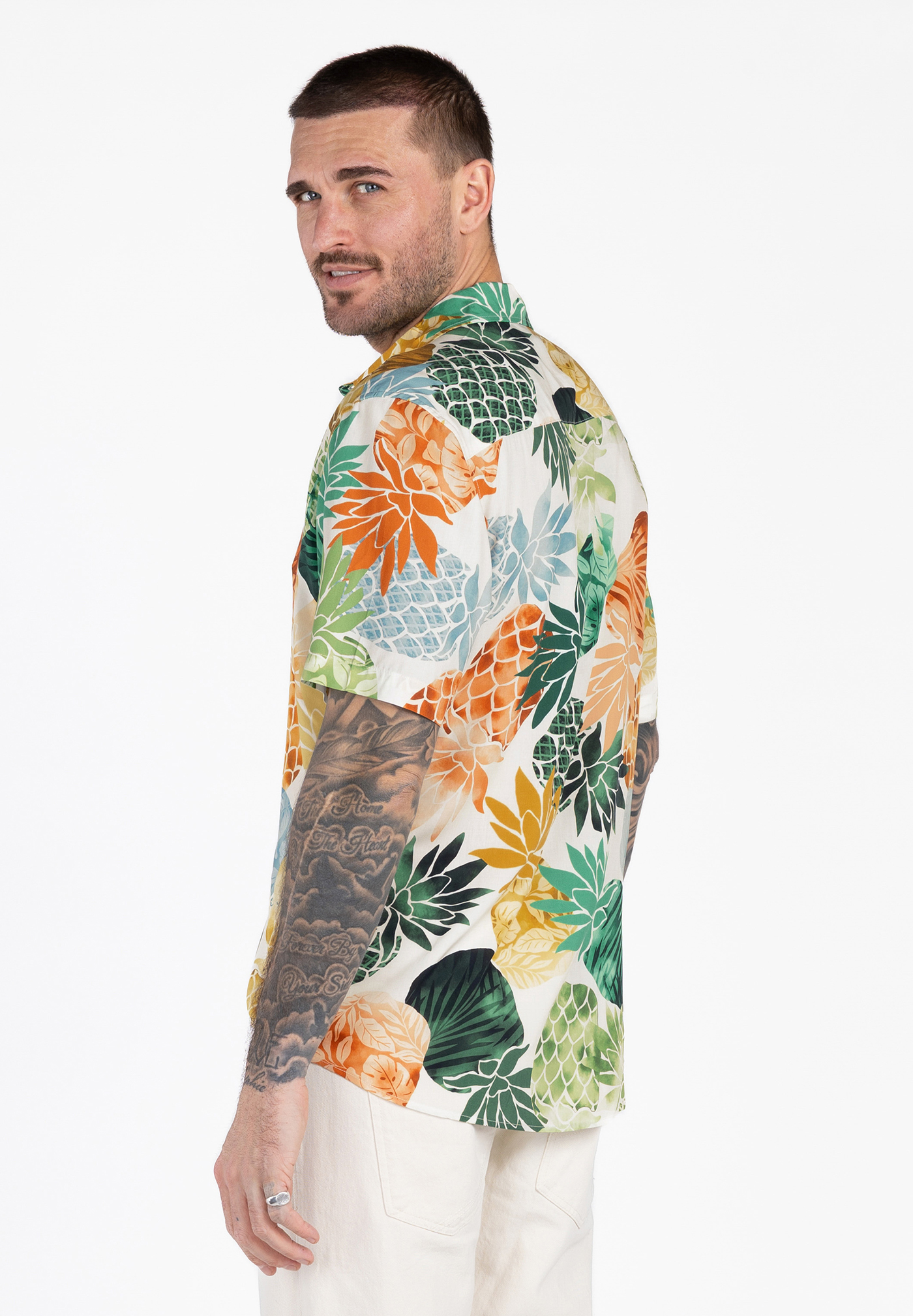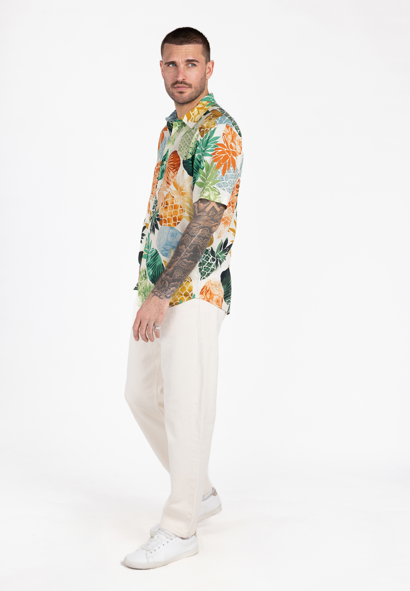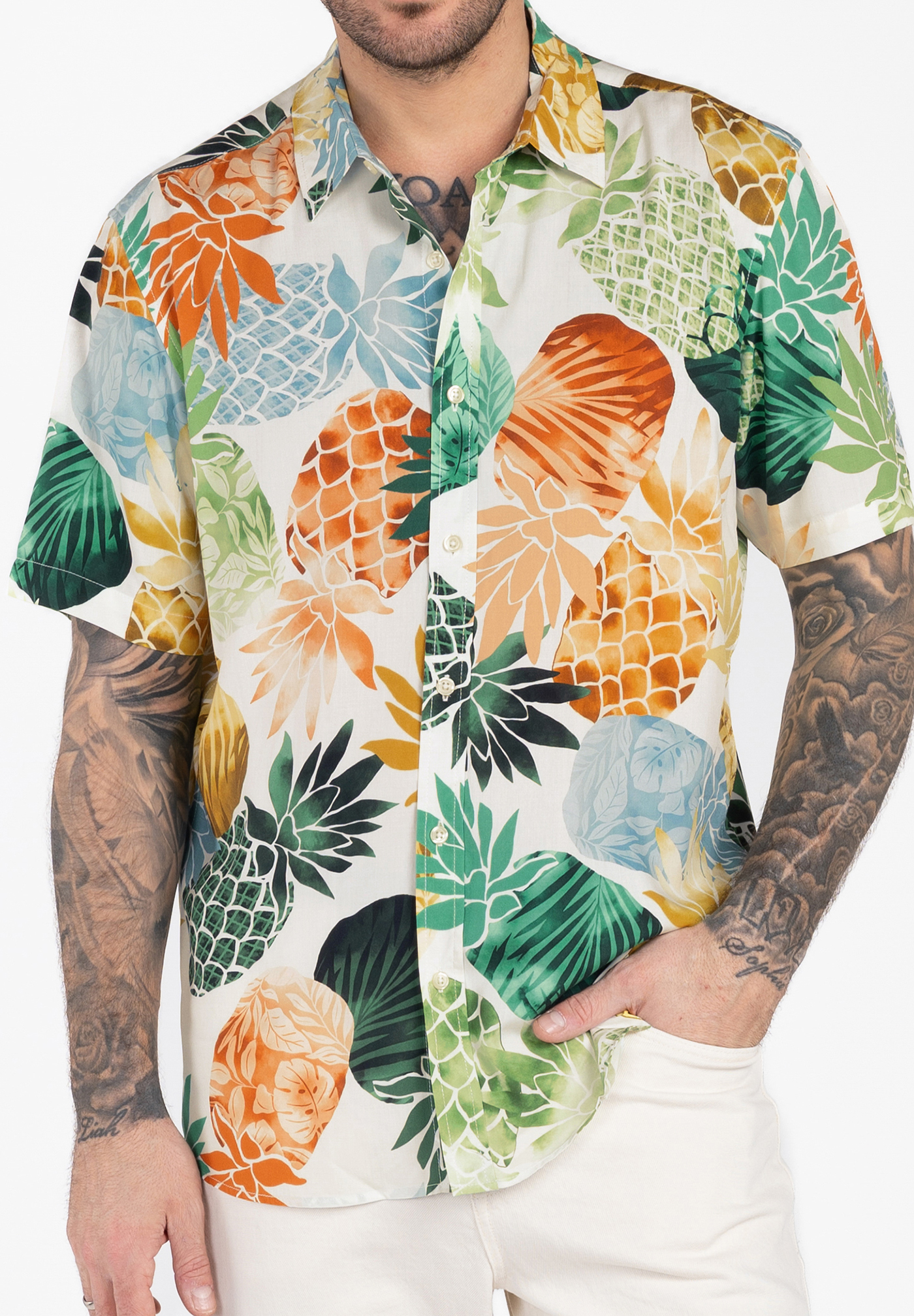 Das Kurzarmhemd begeistert mit einem lebendigen Allover-Ananasprint in warmen und frischen Farbtönen,