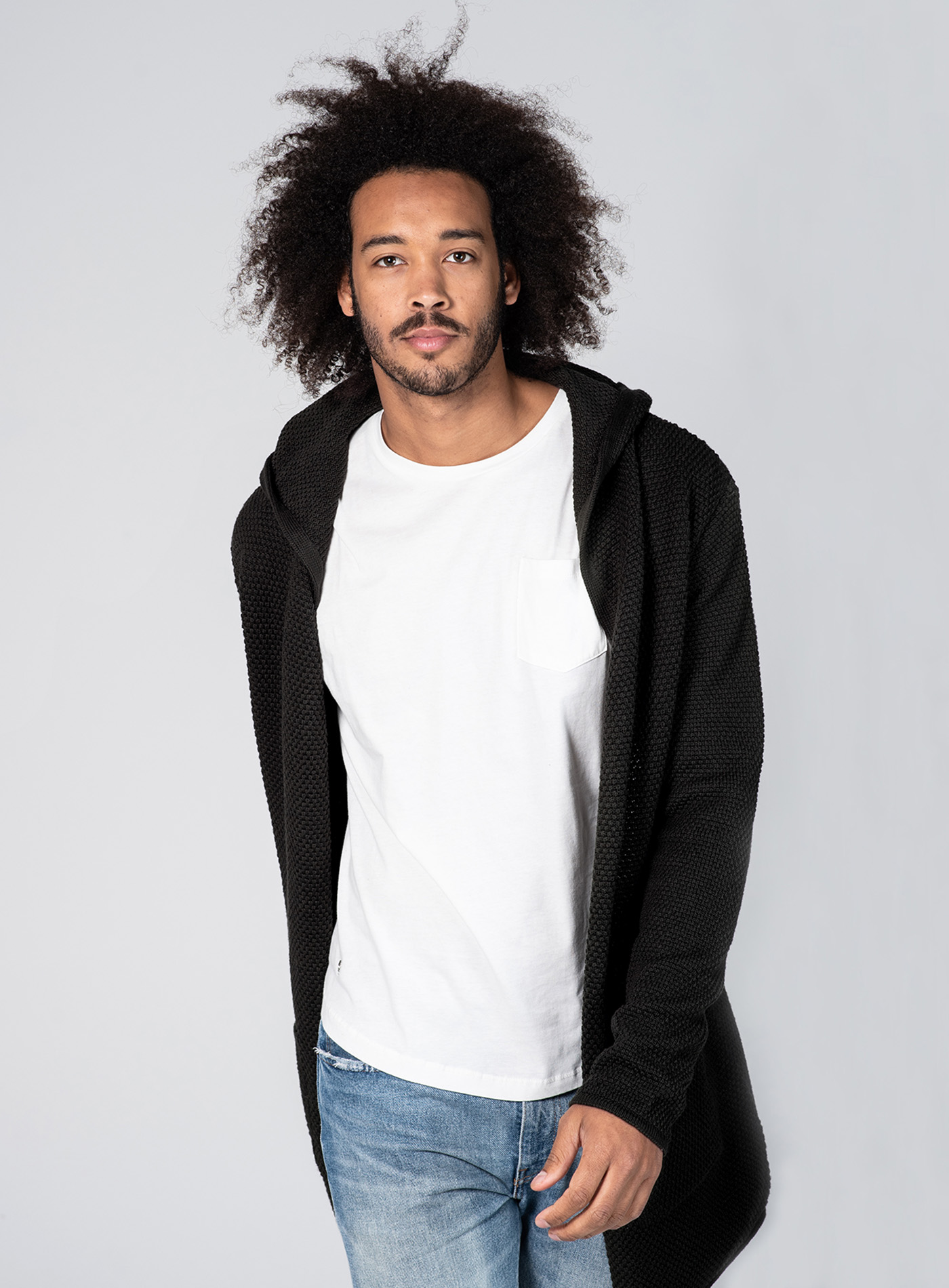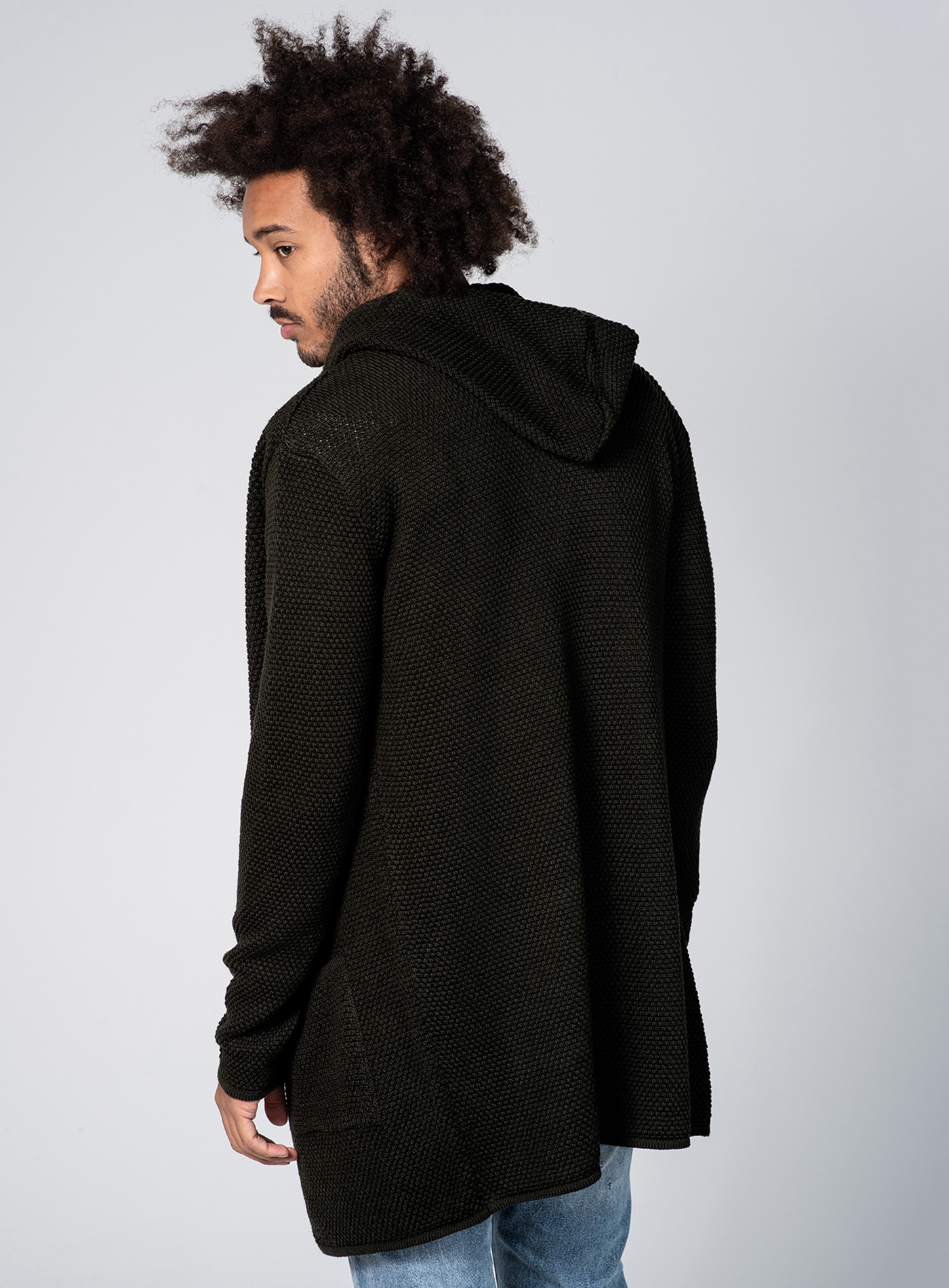 Kapuze und eine lockere, längere Passform. Außerdem hat der Cardigan zwei aufgesetzte Vordertaschen und ist verschlusslos, wodurch man ihn besonders schnell