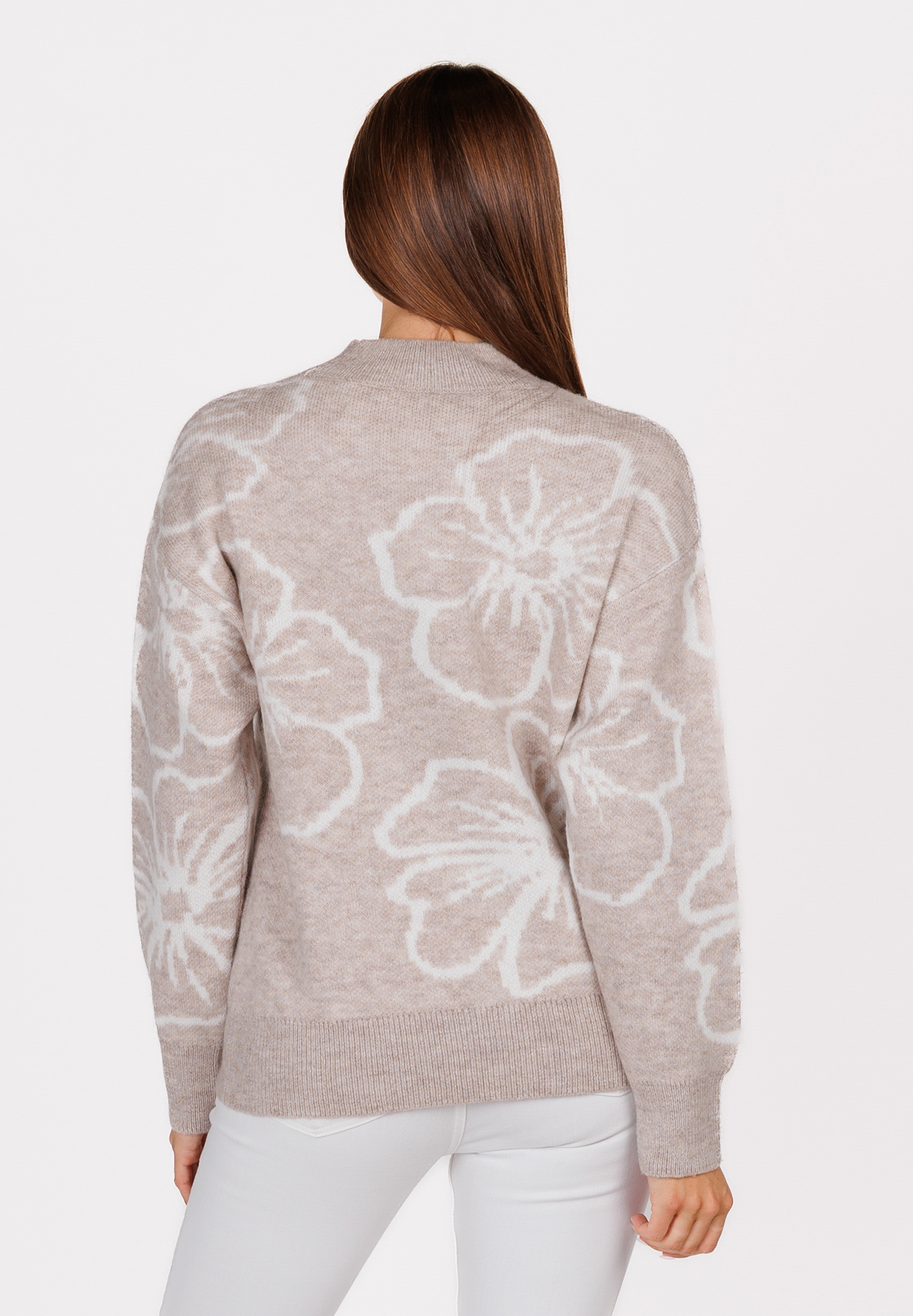 Winterpullover mit floraler Leichtigkeit und weichem Griff. Die großflächigen Blüten sorgen für einen Hauch Poesie auch an frostigen Tagen.
