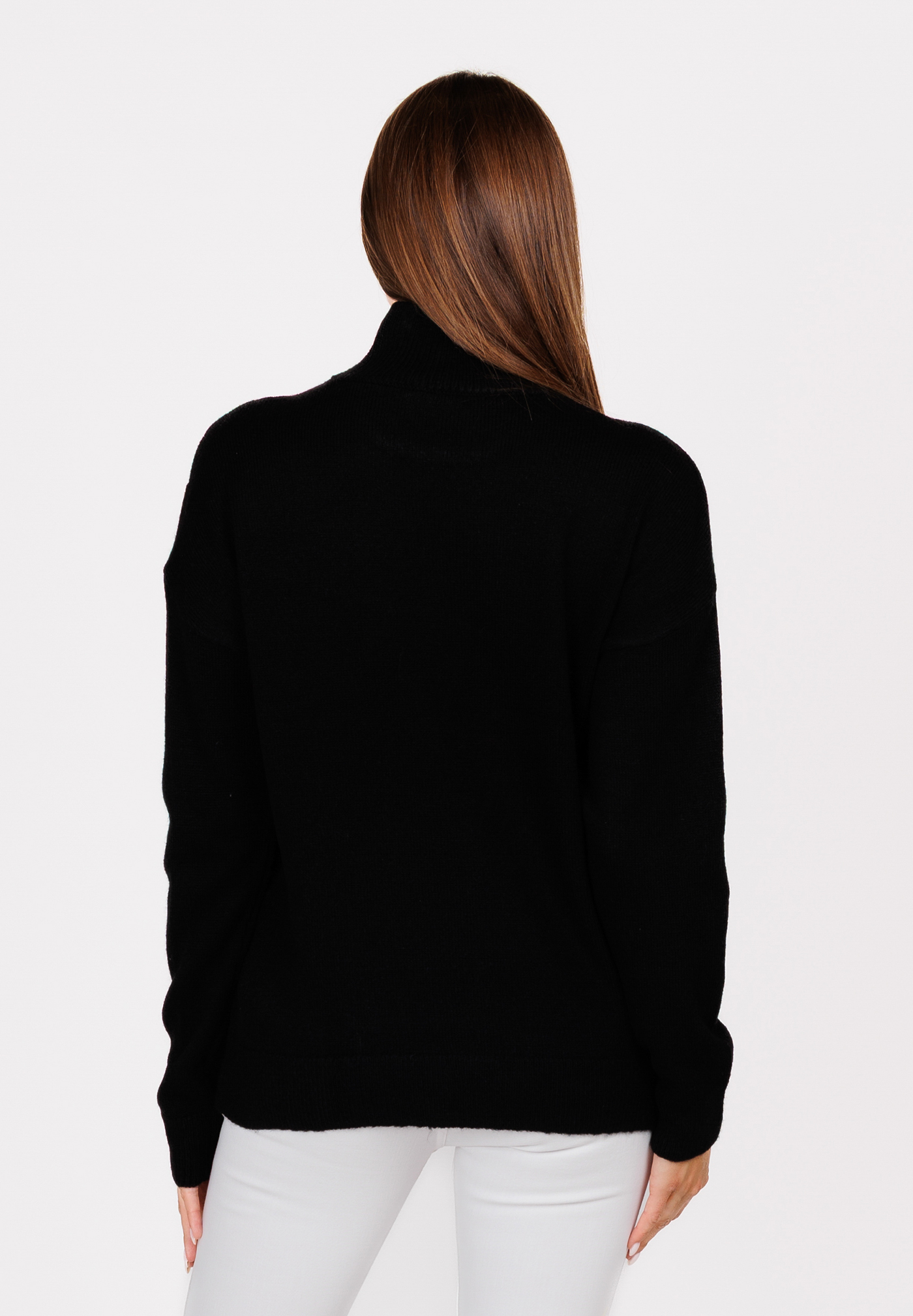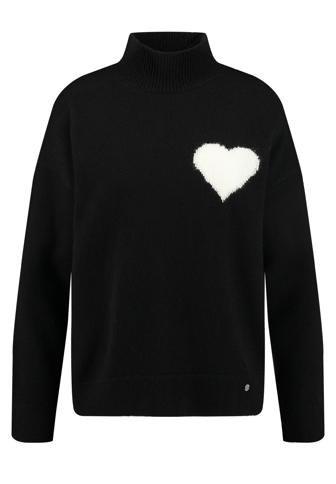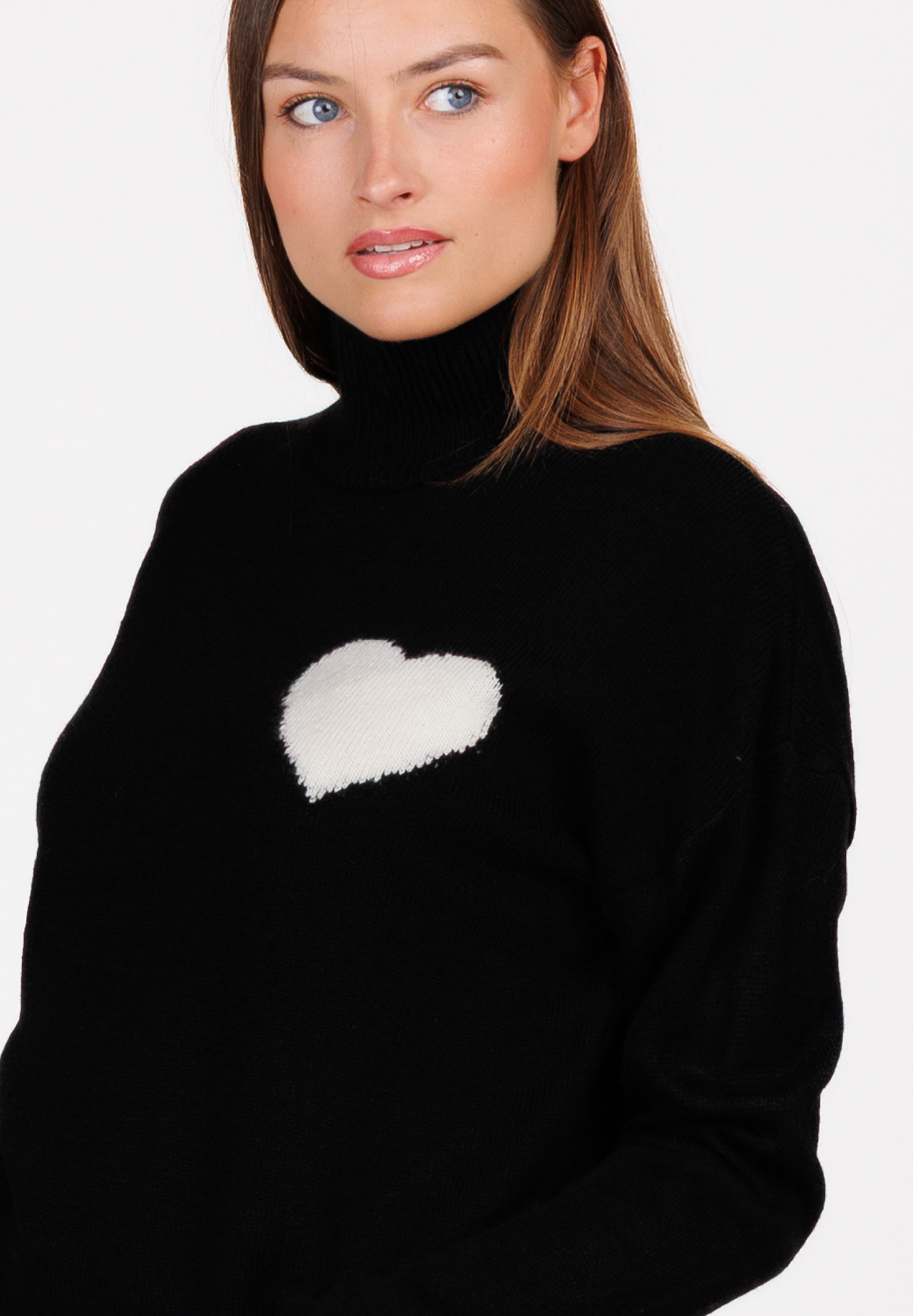 Der cremefarbene Kuschelpullover mit hohem Kragen und plakativem Herz ist ein Statement für alle, die mit Stil fühlen