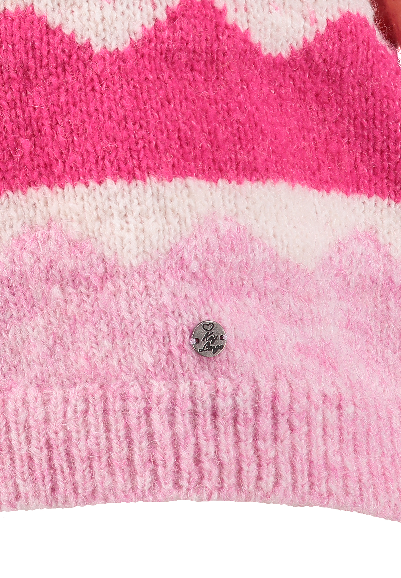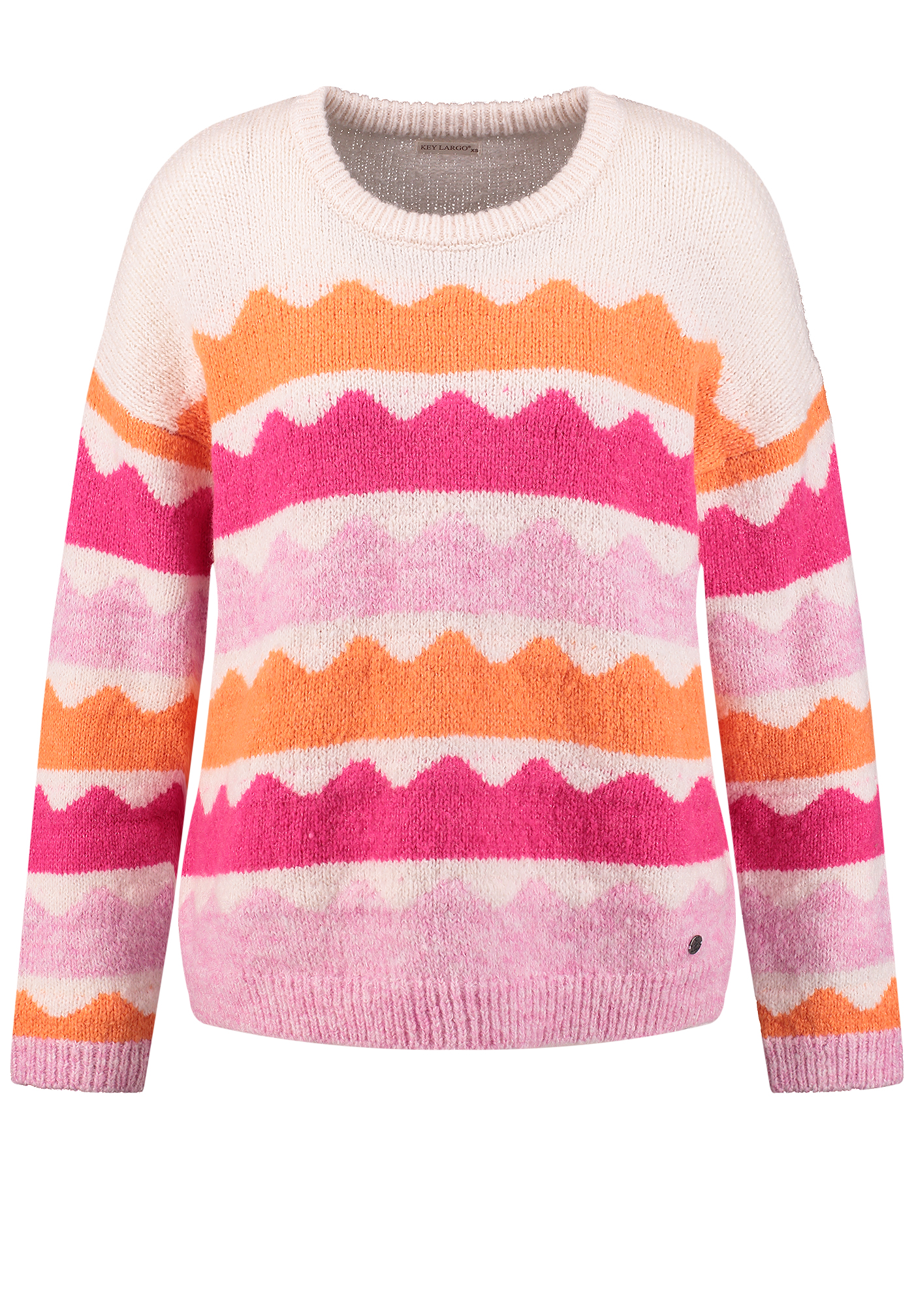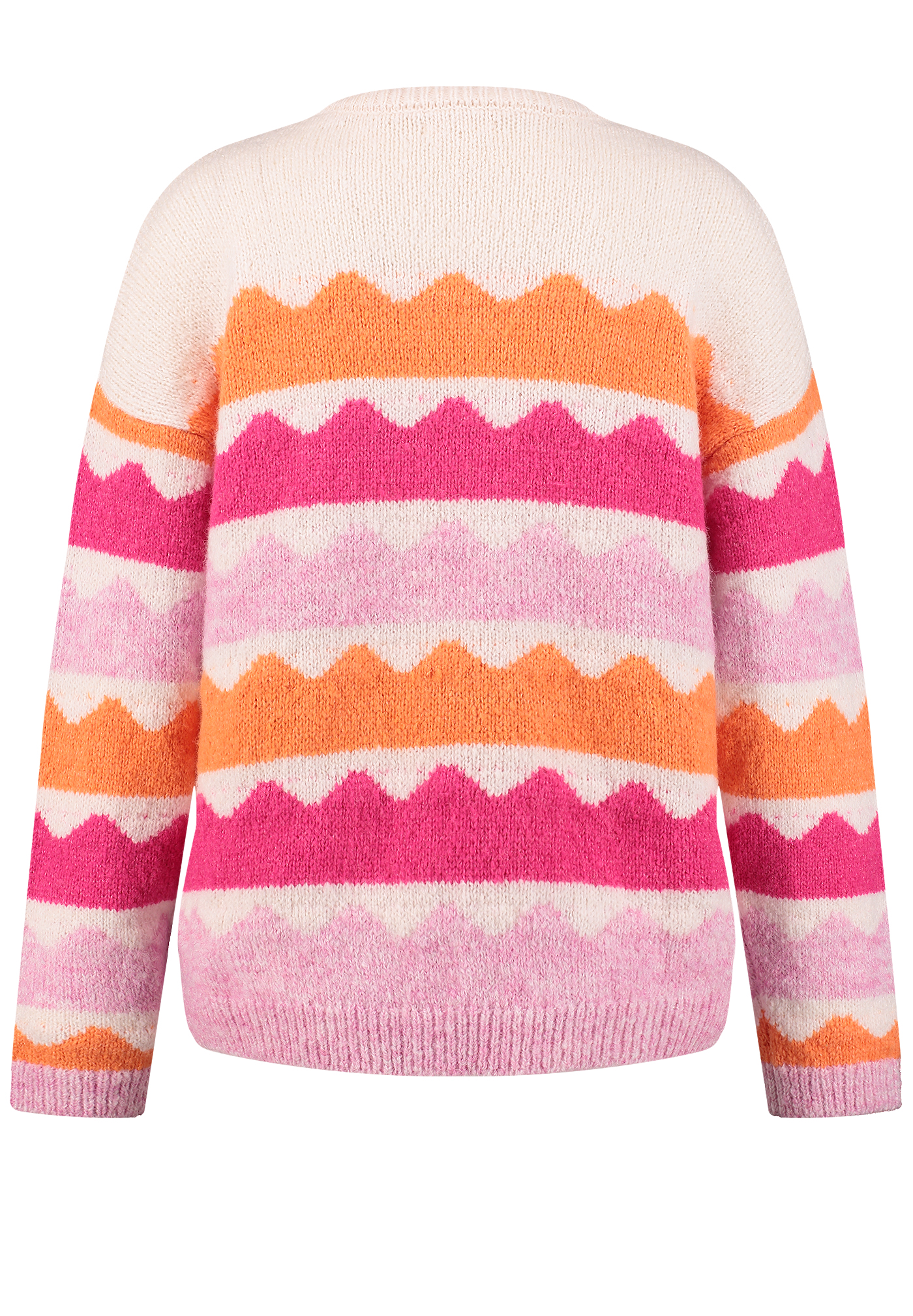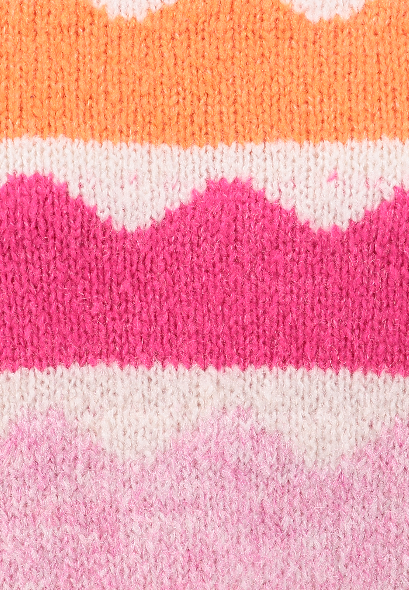 Mit seinen leuchtenden Wellenstreifen in Pink, Orange und Pastellrosa versprüht dieser Strickpullover pure Lebensfreude
