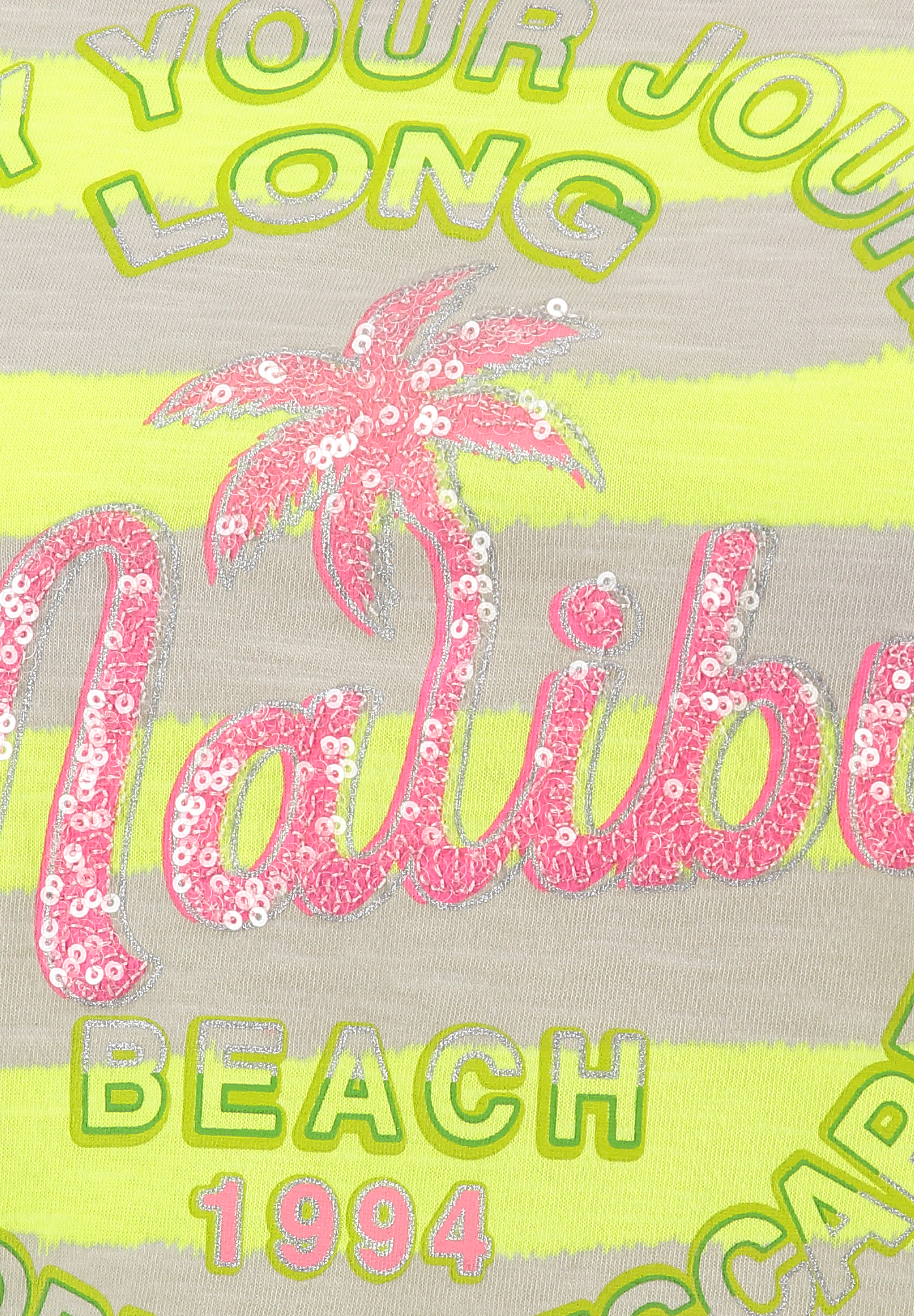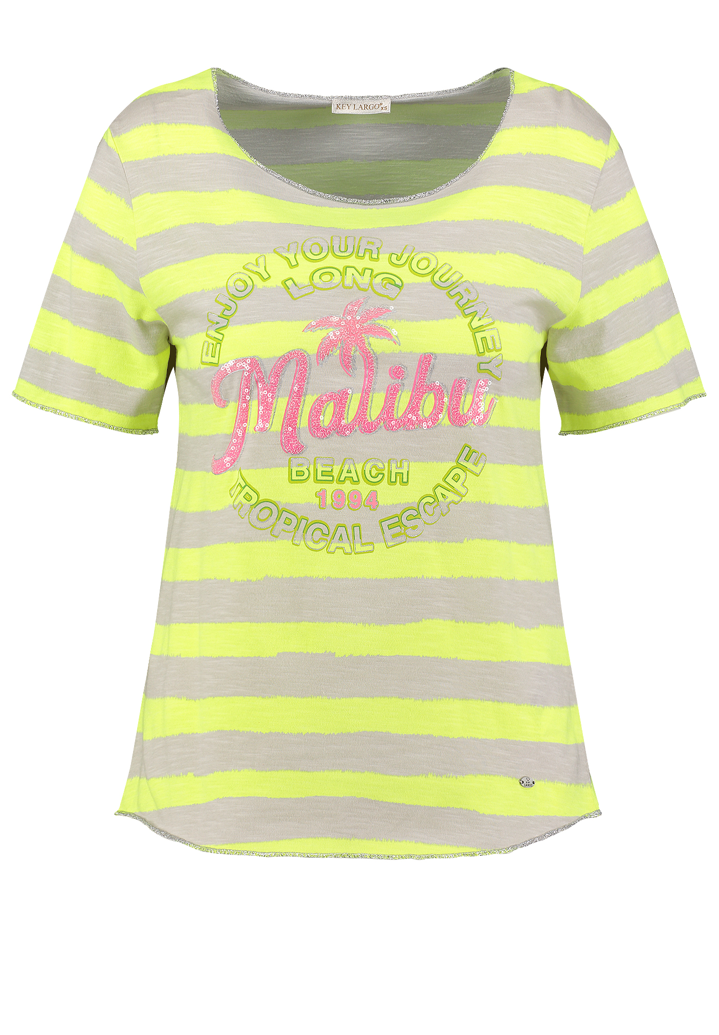 lieben. Das Damen-T-Shirt kombiniert lässige blau-weiße Streifen mit einem trendigen Malibu Beach