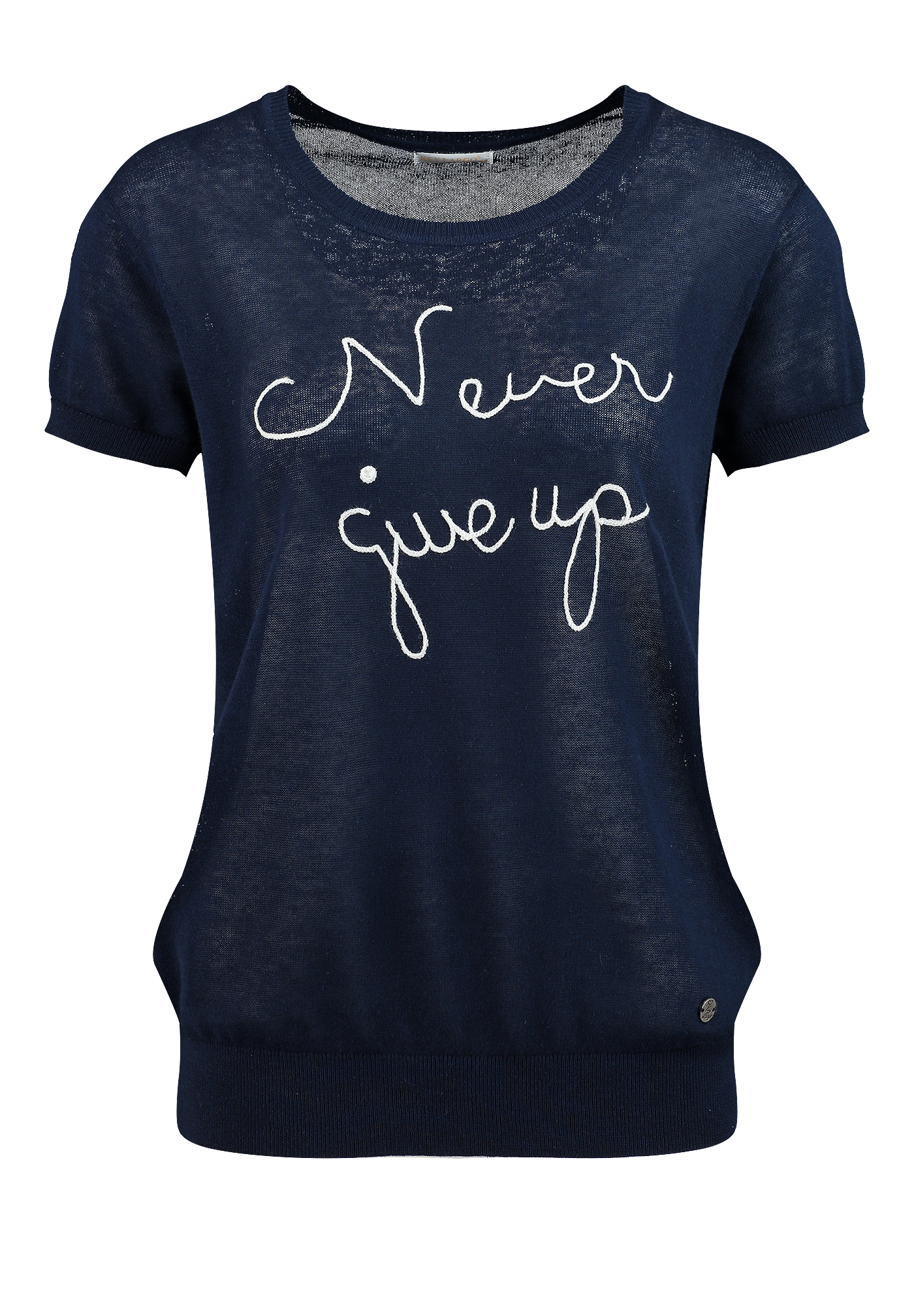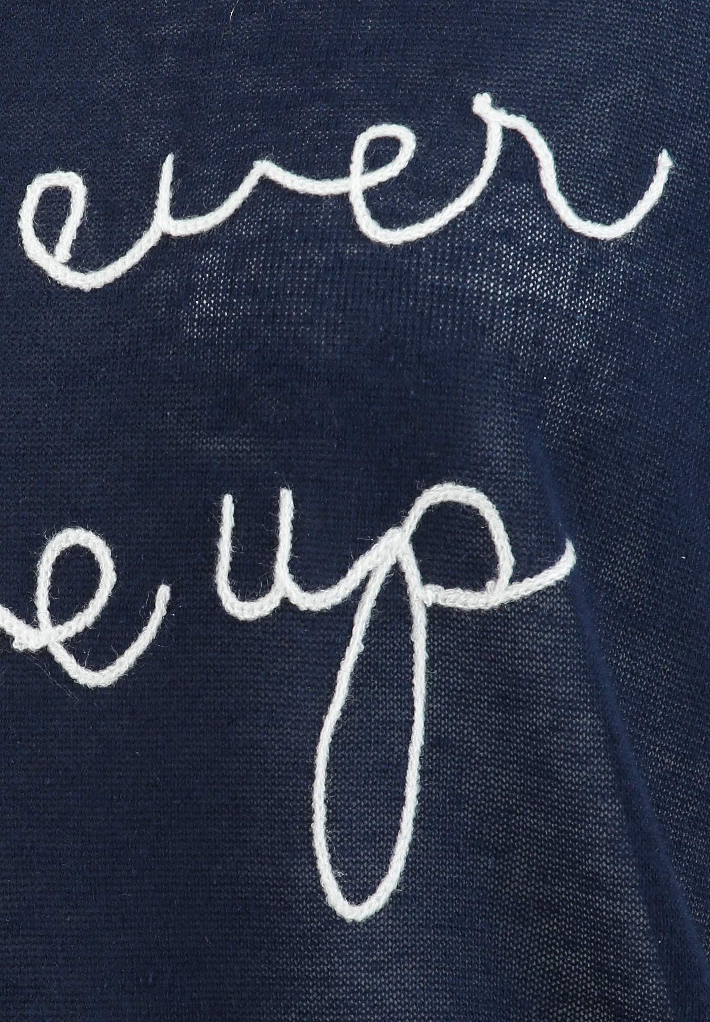 Der feine Strick bekommt durch den eingestrickten Schriftzug Never give up eine inspirierende,